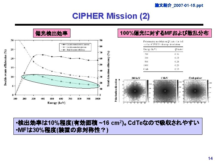 論文紹介_2007 -01 -15. ppt CIPHER Mission (1) • Caroli et al. 2000, NIMA 448, 525 • Caroli et al. 2000, Proc. SPIE 4140, 573 • Curado et al. 2003, Proc. SPIE 4843, 543 • Curado et al. 2003, Experiment Astronomy 15, 45 28 x 35 cm 2 18 x 15 cm 2 Exposed: maskを考慮した面積 Efficient: active area x efficiency • Coded Maskと 1 cm厚のCd. Te検出器の組み合わせ。(2 x 2 mm 2)x(64 x 64)x 4 ~160 cm 2 • 1次元pixel化Cd. Teを横に並べ 2次元イメージング。隙間が非対称なので、4モジュールを 90度 ずつまわして配置。 • TungstenとCs. Iでシールド。視野は 10度程度(~0. 03 sr) • 100 ke. V以下はイメージングモード。100 ke. V以上でpolarimeterモード (100 ke. V-1 Me. V) 13
