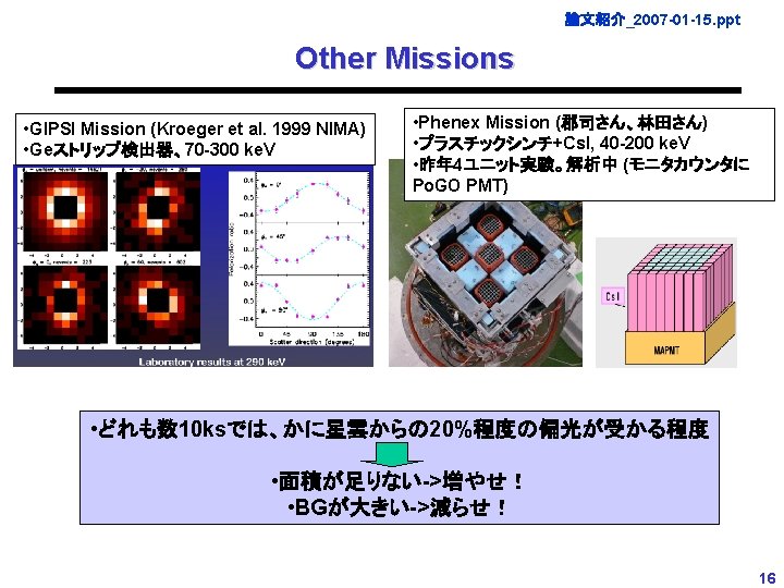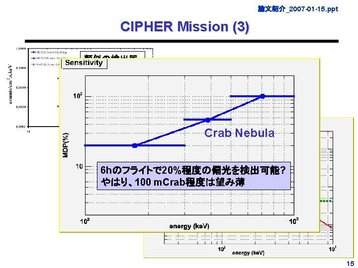 論文紹介_2007 -01 -15. ppt Grape Mission (3) N=36, 0. 1 sr (1 m length), perfect anti-coincidence shield Crab vs. BG Crab Nebula BG ~ 1 Crab 6 hのフライトで、20%程度の偏光を検出可能? 100 m. Crab以下はほぼ絶望的 30 300 12