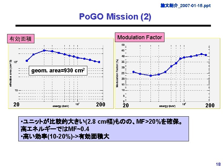 論文紹介_2007 -01 -15. ppt GRAPE Mission (2) • 2 x 2=4 modulesの場合の有効面積およびMF • MF~0. 4だが、効率は数% Modulation Factor 6 x 6=36 modules (geom. area~1000 cm 2) geom. area~100 cm 2 30 300 11