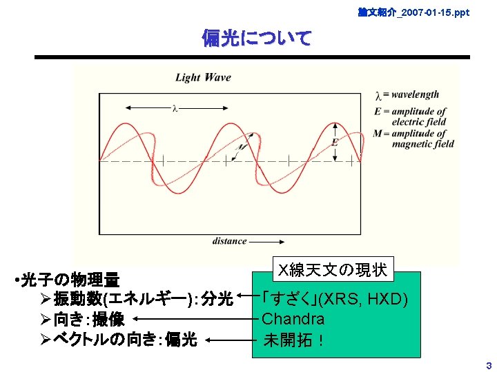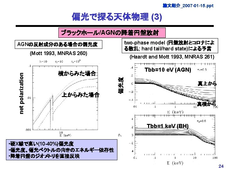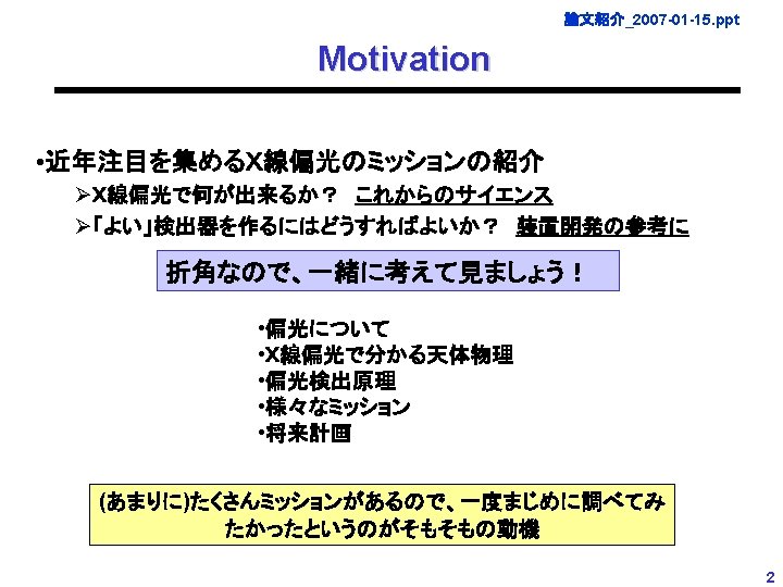 論文紹介_2007 -01 -15. ppt 論文紹介07: X-ray Polarimetry Missions January 15, 2007 Tsunefumi Mizuno Hiroshima University M. Mc. Connel "Status and Future Prospects for gamma-ray Polarimetry" and references therein (X-Ray Polarimetry Workshop at SLAC/Stanford, 2004; http: //www-conf. slac. stanford. edu/xray_polar/XRay%20 presentations/Mc. Connell_Gamma_Review. pdf) 1