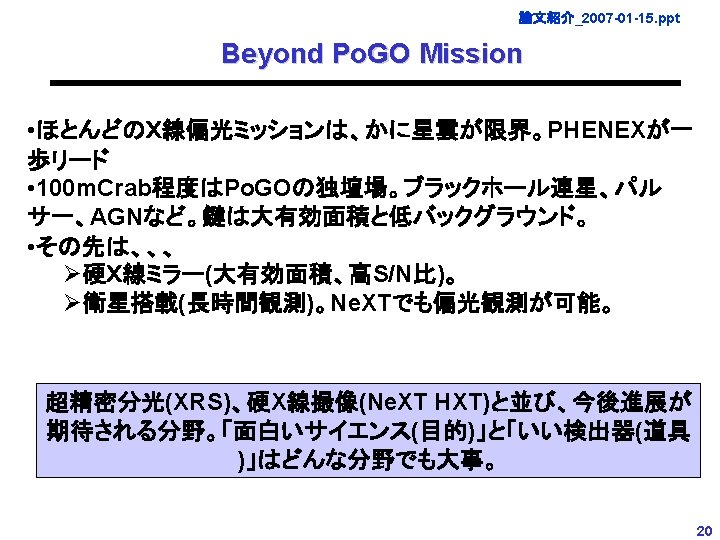 論文紹介_2007 -01 -15. ppt Po. GO Mission (3) 大面積、低バックグラウンド Expected source and BG spectra かに星雲なら数%、1/10の強度の天体でも 10 -20%の偏光まで検出可能 100 m. Crab(incident) 100 m. Crab (detected) 100 m. Crab BG total (CXB/ atmospheric downward/upward) Crab Nebula Full simulationによる評価。BG~10 -20 m. Crab (極めて低いバックグラウンド) 20 20 100 ke. V 200 19
