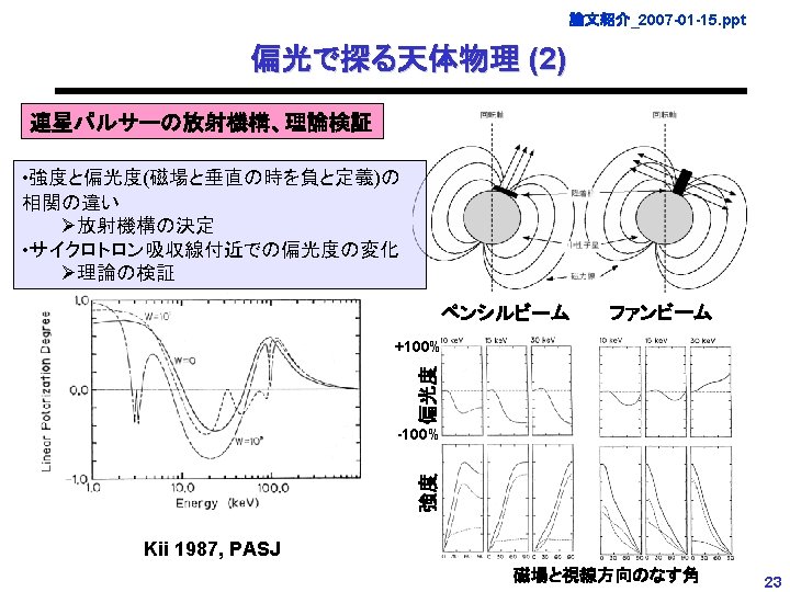論文紹介_2007 -01 -15. ppt 偏光で探る天体物理 (1) Dyks and Rudak, Ap. J, 2003 単独パルサーの放射機構 Polar Cap Model P 2 Polar cap Caustic 偏光方位角 強度 Outer gap モデル毎に異なる偏光度、方 位角が予想される (Alice Hardingによる計算) 偏光度 P 1 Outer Gap Model Slot Gap/Caustic Model 位相 22