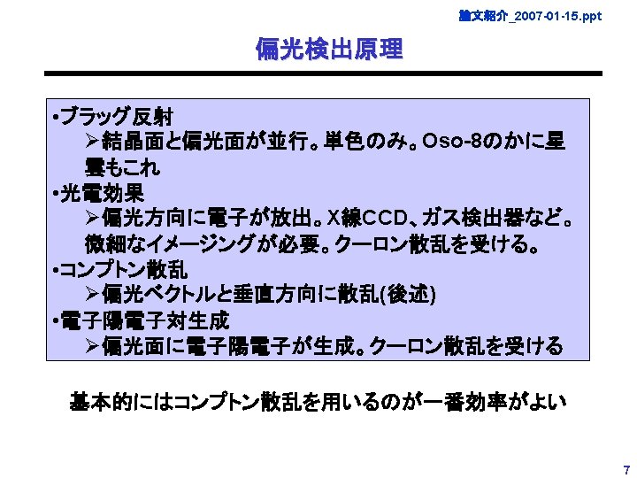 論文紹介_2007 -01 -15. ppt What can polarization tell us about HE objects? かに星雲+かにパルサー Nebula+pulsar 1 Crab/~0. 1 Crab --- Processes known to polarize hard X-rays --Vela X-1 pulsar ~1 Crab • Synchrotron pol. vector is perpendicular to magnetic field Heremission: X-1 ~0. 1 Crab and can tell 4 U 0115+63 us the direction of the field. ~0. 1 Crab • SNRs, Pulsars, AGN jets, micro-quasars and GRBs V 0332+53 ~0. 1 Crab • Compton Scattering: pol. vector. BH is perpendicular to the plane of Cyg X-1 ~1 Crab scattering and can tell us the geometry of the photon source and the GX 339 -4 ~0. 1 Crab IE 1740. 7 -292 ~0. 1 Crab scatterer (e. g. , accretion disk) GS 2000+25 ~0. 1 Crab • BH binaries, Seyfert AGNs GRS u. QSO ~0. 1 Crab • Propagation of 1915+105 photons in strong magnetic field: photons with pol. GRO J 1655 -40 vector perpendicular to magneticu. QSO field are highly~1 Crab absorbed. Good for Mkn 501 electrodynamics AGN and reconstruction ~0. 1 Crab of the test of quantum Cen. A ~0. 1 Crab direction of the magnetic field. et al. 2005, proc. SPIEなどより) • Isolated pulsars, (Kataoka NS binaries with a strong cyclotron line. 磁場や散乱の絡む系(ほぼ全ての非熱的放射)で、系のジオ メトリを直接探る唯一の手段 詳しくは巻末の資料も参照(林田さんのトラペからいろいろ借用) 6