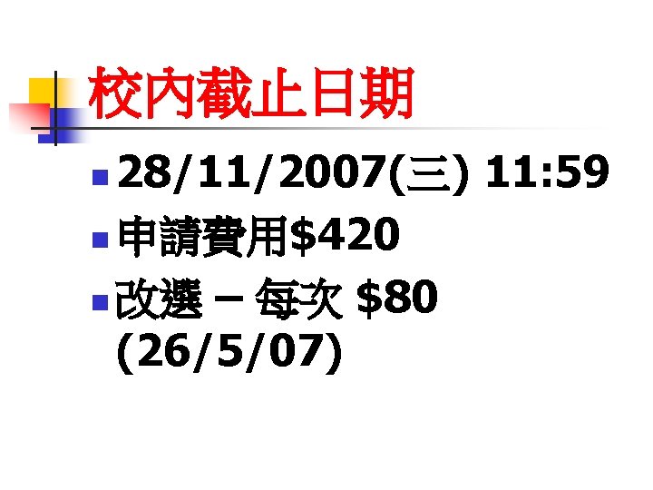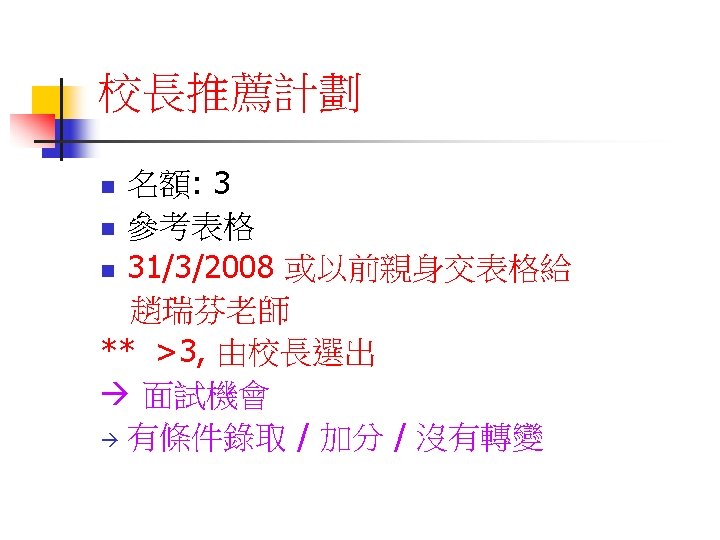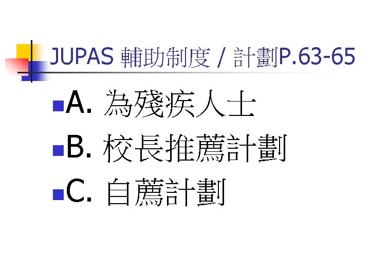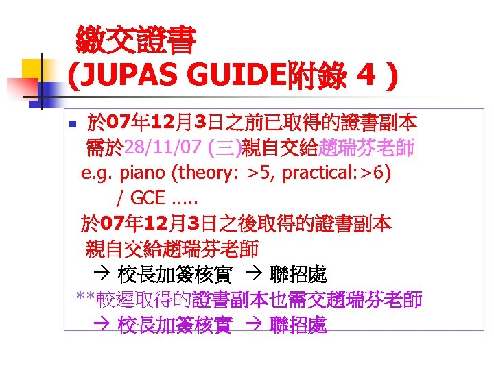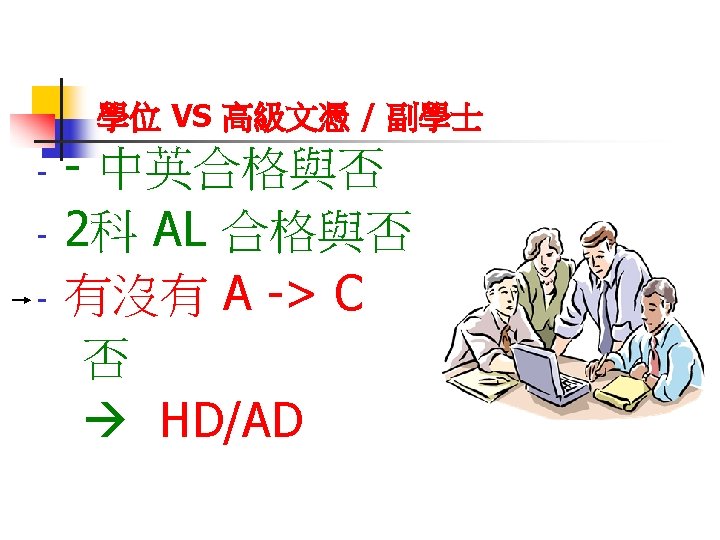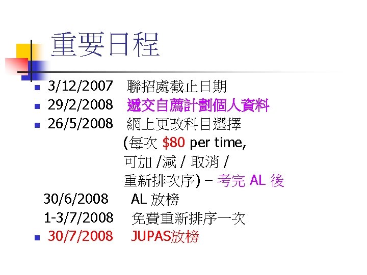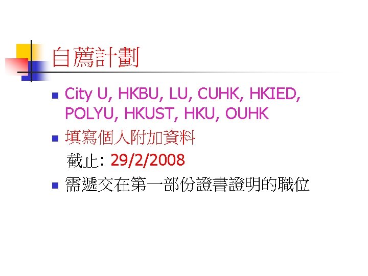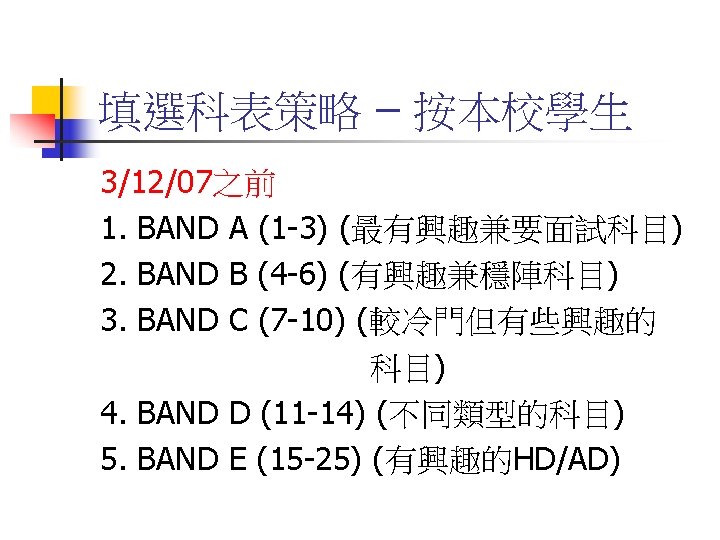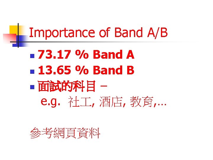 General and Specific requirement 1. MUST meet BOTH requirements selection process by computer 2. 中、英(E/level 2) + 3 AL /2 AL 3. HKU: D grade in UE 4. City. U: D grade in HKCEE Maths in Business subjects 4. HKCEE results very important for CUHK programs 5. CUHK: 7 subjects in one sitting of HKCEE 6. Poly U Nursing HD – D grade in syl B ENG Nursing D – E grade in syl B ENG