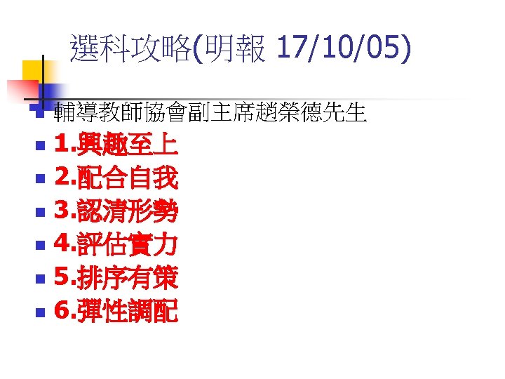 Consider the following : 1. Academic (學術上): Science / Art -> 2. Field interested (有興趣的範疇) 3. Personality, Strength and weakness hobbies (個人的強弱項) 4. ECA in school WHAT YOU LEARN (課外活動 ) 5. Expectation of tertiary education and career aspirations (對大學教育及事業的期 望)