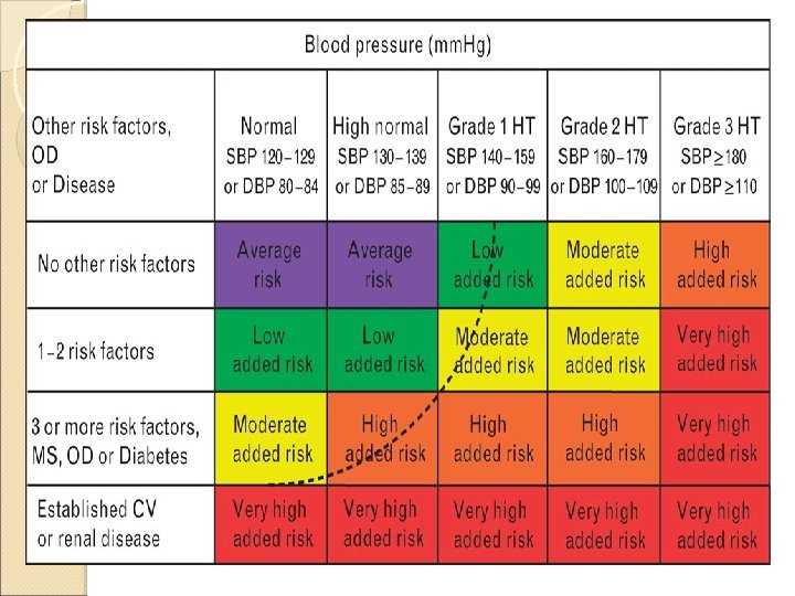 High/Very high risk subjects BP 180 mm. Hg systolic and/or 110 mm. Hg diastolic Systolic BP. 160 mm. Hg with low diastolic BP (, 70 mm. Hg) † Diabetes mellitus † Metabolic syndrome † 3 cardiovascular risk factors † One or more of the following subclinical organ damages: – Electrocardiographic (particularly with strain) or echocardiographic (particularly concentric) left ventricular hypertrophy – Ultrasound evidence of carotid artery wall thickening or plaque – Increased arterial stiffness – Moderate increase in serum creatinine – Reduced estimated glomerular filtration rate or creatinine clearance – Microalbuminuria or proteinuria Established cardiovascular or renal disease