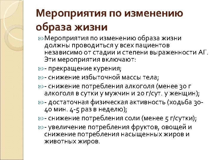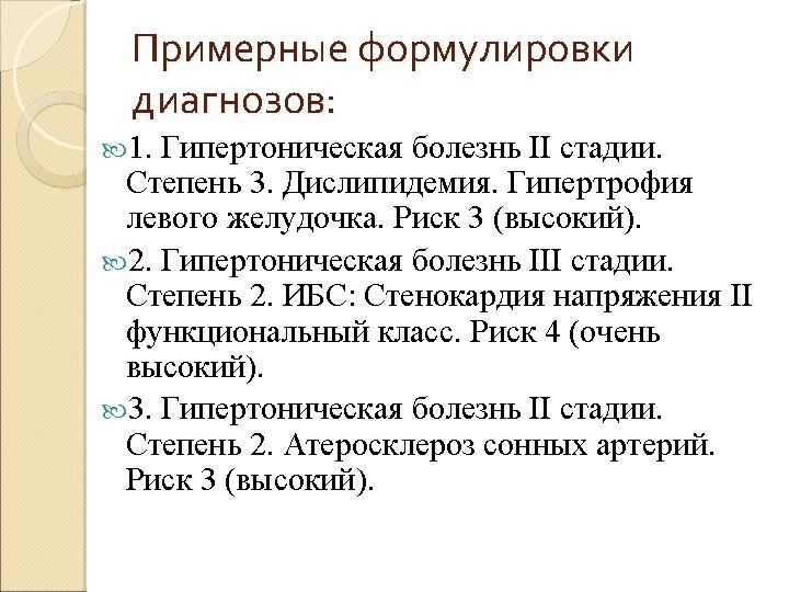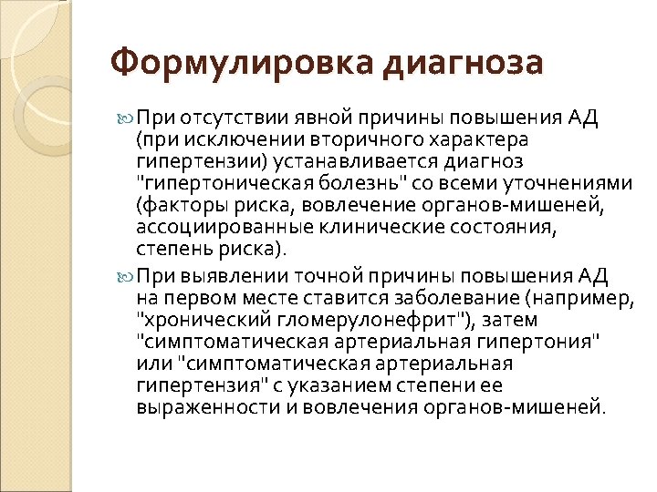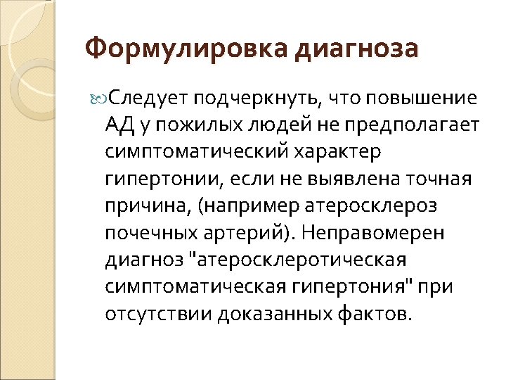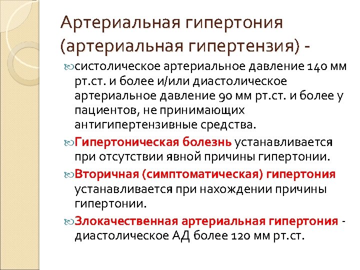 Определение и классификация уровней АД (мм рт. ст. ) Category Systolic Diastolic Optimal 120 80 Normal and/or 120– 129 80– 84 High normal 130– 139 85– 89 Grade 1 hypertension 140– 159 90– 99 Grade 2 hypertension 160– 179 100– 109 Grade 3 hypertension 180 110 Isolated systolic hypertension 140 and 90 Isolated systolic hypertension should be graded (1, 2, 3) according to systolic blood pressure values in the ranges indicated, provided that diastolic values are , 90 mm. Hg. Grades 1, 2 and 3 correspond to classification in mild, moderate and severe hypertension, respectively.