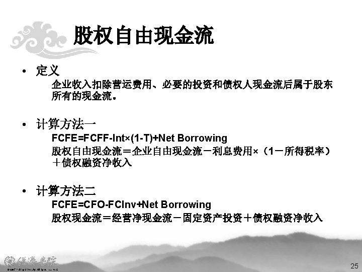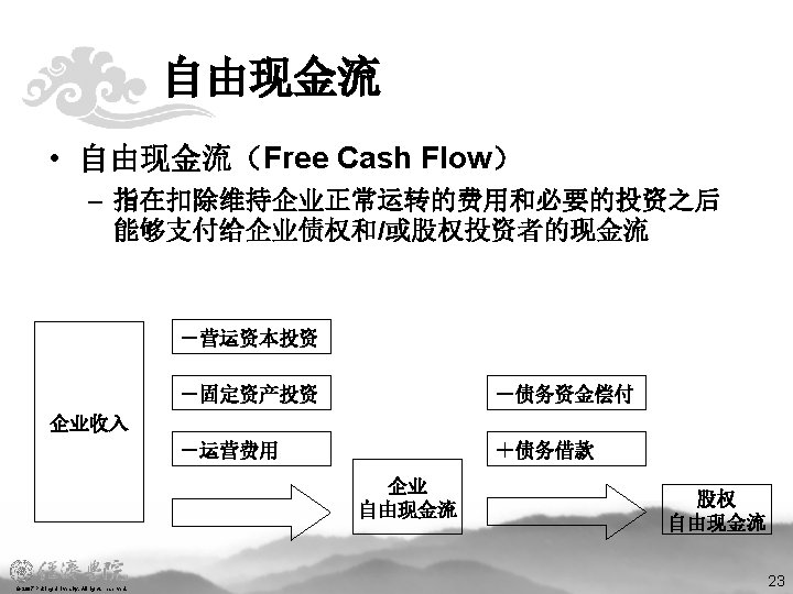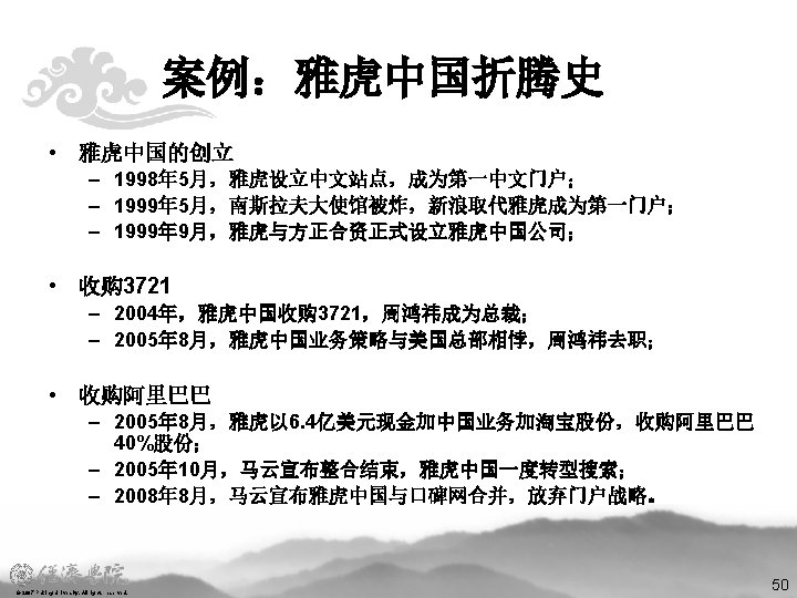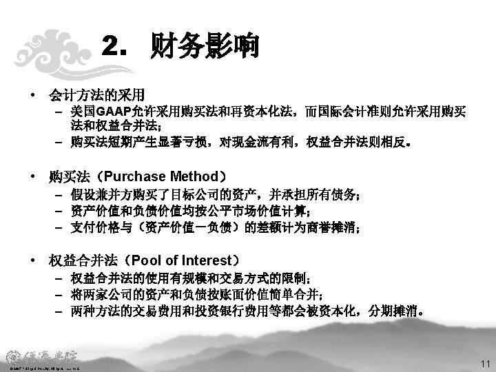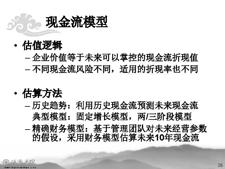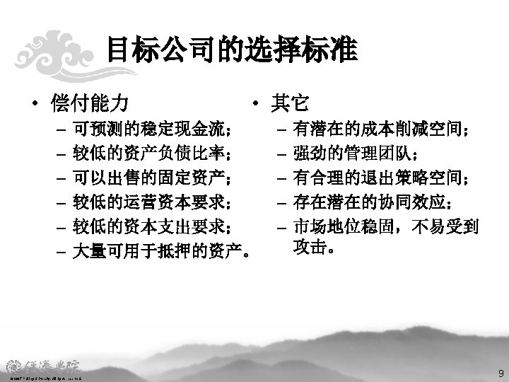 并购与经济周期 1996 -2006 4, 000 30. 0% 10亿美元 3, 500 25. 0% 3, 000 20. 0% 2, 500 2, 000 15. 0% 1, 500 10. 0% 1, 000 5. 0% 500 0 1996 1997 1998 1999 美国并购规模 私募股权占美国并购比例 2000 2001 2002 2003 2004 2005 2006 0. 0% 全球并购规模 私募股权占全球并购比例 资料来源: Thomson Financial © 2007 Peking University, All rights reserved. 2