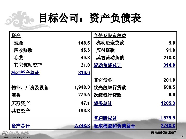 利润试算表预测 FYE 12/31 � 售收入 � 售成本 � 售利� 管理� 用 其它��� 用 EBITDA 2007 PF 3, 139. 8 1, 591. 2 1, 548. 6 273. 4 664. 5 610. 7 2008 3, 532. 3 1, 766. 1 1, 766. 2 282. 6 706. 5 777. 1 2009 3, 973. 8 1, 947. 2 2, 026. 6 317. 9 755. 0 953. 7 2010 4, 410. 9 2, 117. 6 2, 293. 3 352. 9 838. 1 1, 102. 3 2011 4, 852. 0 2, 304. 7 2, 547. 3 388. 2 921. 9 1, 237. 2 2012 5, 288. 7 2, 512. 1 2, 776. 6 423. 1 1, 004. 9 1, 348. 6 折旧 �� EBIT 309. 8 5. 9 295. 0 398. 2 5. 9 373. 0 497. 6 5. 9 450. 2 607. 8 5. 9 488. 6 729. 1 5. 9 502. 2 782. 9 559. 8 交易� 的�� 基金管理� � 利息� 用 �� 外收入/支出 利��� 12. 3 1. 0 236. 0 6. 9 38. 8 12. 3 1. 0 236. 0 6. 9 116. 8 12. 3 1. 0 229. 2 6. 9 200. 8 12. 3 1. 0 216. 4 6. 9 252. 0 12. 3 1. 0 198. 1 6. 9 283. 9 12. 3 1. 0 175. 3 6. 9 364. 3 14. 2 24. 6 0. 0 24. 6 42. 9 73. 9 0. 0 73. 9 73. 8 127. 0 0. 0 127. 0 92. 7 159. 3 0. 0 159. 3 104. 3 179. 6 0. 0 179. 6 133. 9 230. 4 0. 0 230. 4 所得税 � 利� � 先股� 利 普通股� 利� © 2007 Peking University, All rights reserved. 16
