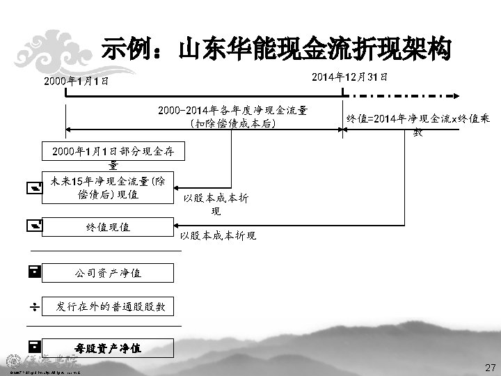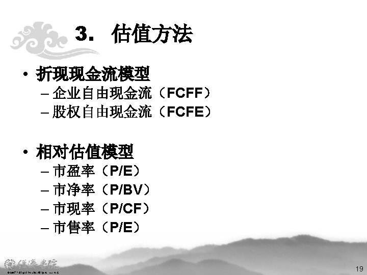 退出收益预测 2010 退出年份 2011 2012 5 x 5. 5 x 6 x EBITDA 1, 102. 3 1, 237. 2 1, 348. 6 企� 价� 5, 511. 6 6, 062. 8 6, 614. 0 6, 186. 1 6, 804. 7 7, 423. 3 6, 743. 0 7, 417. 3 8, 091. 6 ���� 2, 235. 2 1, 895. 3 1, 504. 9 股� 价� 3, 276. 4 3, 827. 6 4, 378. 8 4, 290. 8 4, 909. 4 5, 528. 0 5, 238. 1 5, 912. 4 6, 586. 7 19. 7 23. 0 26. 3 25. 7 29. 5 33. 2 31. 4 35. 5 39. 5 25. 3% 31. 9% 38. 0% 26. 7% 31. 0% 35. 0% 25. 7% 28. 8% 31. 6% 3, 256. 8 3, 804. 6 4, 352. 5 4, 265. 1 4, 880. 0 5, 494. 9 5, 206. 7 5, 876. 9 6, 547. 2 28. 7% 35. 5% 41. 7% 29. 2% 33. 7% 37. 7% 27. 8% 30. 9% 33. 8% 价� 乘数 � 理� 股� 价� � 理� IRR 基金股��� 基金IRR © 2007 Peking University, All rights reserved. 18
