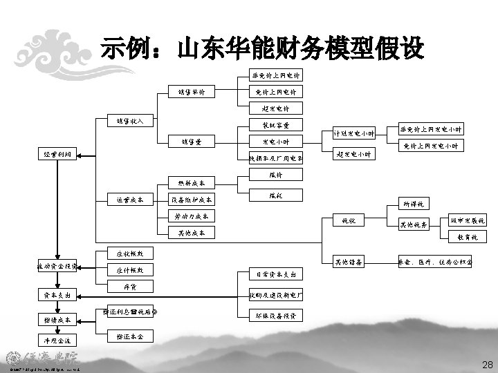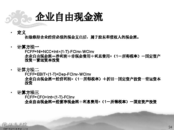 利润试算表的依据 2007 PF � 售收入增� 率 2008 2009 2010 2011 2012 12. 5% 11. 0% 10. 0% 9. 0% � 售成本比例 50. 7% 50. 0% 49. 0% 48. 0% 47. 5% � 售利� 率 49. 3% 50. 0% 51. 0% 52. 5% 管理� 用/� 售收入 8. 7% 8. 0% 其它� 用/� 售收入 21. 2% 20. 0% 19. 0% EBITDA/� 售收入 19. 5% 22. 0% 24. 0% 25. 5% 9. 4% 10. 6% 11. 3% 11. 1% 10. 4% 10. 6% 有效税率 36. 6% 36. 7% 36. 8% � 利� 率 0. 8% 2. 1% 3. 2% 3. 6% 3. 7% 4. 4% 200. 3% 71. 9% 25. 4% 12. 7% 28. 3% EBIT/� 售收入 � 利� 成� 率 © 2007 Peking University, All rights reserved. 17