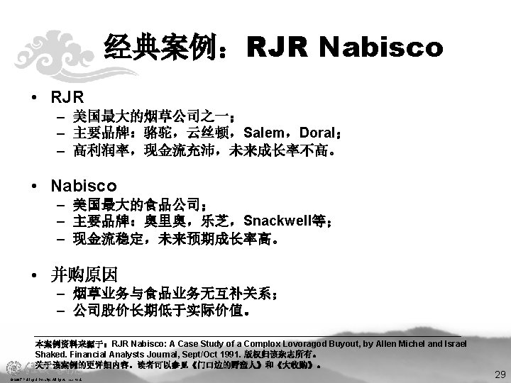 RJR Nabisco主要财务数据 利� 表 烟草� 售收入 食品� 售收入 �� 售收入 烟草�� 利� 食品�� 利� ��� 利� 折旧 EBIT 利息� 用 � 利� ���� 表 ��� � 期�� � 运� 本 1985 1986 1987 1988 5, 422. 0 6, 200. 0 11, 622. 0 1, 843. 0 549. 0 2, 392. 0 354. 0 1, 949. 0 337. 0 1, 001. 0 5, 866. 0 2, 236. 0 15, 102. 0 1, 659. 0 820. 0 2, 479. 0 605. 0 2, 340. 0 565. 0 1, 064. 0 6, 346. 0 9, 420. 0 15, 766. 0 1, 821. 0 915. 0 2, 736. 0 652. 0 2, 304. 0 489. 0 1, 289. 0 7, 068. 0 9, 888. 0 16, 956. 0 1, 924. 0 1, 215. 0 3, 139. 0 730. 0 2, 848. 0 579. 0 1, 393. 0 16, 414. 0 5, 628. 0 1, 617. 0 16, 701. 0 5, 514. 0 1, 329. 0 16, 861. 0 5, 681. 0 1, 717. 0 16, 895. 0 5, 262. 0 1, 795. 0 资料来源:Nabisco 1988招股书,转引自Financial Analysts Journal © 2007 Peking University, All rights reserved. 30