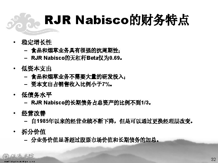 RJR Nabisco主要财务数据 1985 1986 1987 1988 946. 0 1, 022. 0 936. 0 1, 142. 0 ��� 收益率(%) 26. 0 19. 0 20. 8 17. 1 ��� 收益率(%) 15. 5 14. 1 13. 7 11. 5 �� 周� 率 0. 92 0. 91 0. 94 1. 00 存� 周� 率 10. 0 9. 7 5. 1 3. 9 � 利支付率(%) 31. 2 39. 3 37. 3 36. 5 最高 35 55 1/8 71 1/8 94 4/8 最低 24 6/8 31 34 6/8 54 6/8 流通股份� 数(百万) 258. 6 250. 4 247. 4 223. 5 其它�� 数据 � 本支出(百万美元) 普通股价格 资料来源:Nabisco 1988招股书,转引自Financial Analysts Journal © 2007 Peking University, All rights reserved. 31