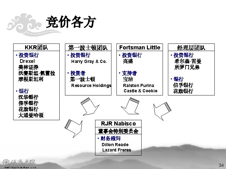 RJR Nabisco分业务价值 (百万美元) 食品���� 12, 100-13, 100 烟草���� 12, 500-13, 000 各���� 24, 600-26, 100 每股价� 各���� 减去:� 期�� 股� 价� 24, 600-26, 100 4, 600 20, 000-21, 500 除以:股份� 数 234 分��� 算股价 85-92美元/股 食品�� � 干�� 蔬菜罐� 水果罐� 麦片 花生 健康食品 巧克力 口香糖 人造黄油 新� 水果 墨西哥食品 牛排� � 物食品 国��� 价� (百万美元) 5, 000 500 300 750 -1, 000 800 -900 400 -500 300 200-300 700 150 100-150 200 2, 500-3, 000 资料来源: R. Alsop, A. M. Freedman and B. Morris, “RJR Takeover Could Hurt Marketers and Consumers, ” Wall Street Journal, December 2, 1988. ,转引自Financial Analysts Journal © 2007 Peking University, All rights reserved. 33