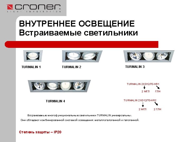 ВНУТРЕННЕЕ ОСВЕЩЕНИЕ Встраиваемые светильники SPINEL 4 SPINEL 3 INDILI 2 SPINEL 2 Степень защиты – IP 20 SPINEL 1 FLUORIT CIRCO 02 FLUORIT QUADRA