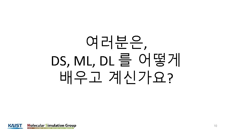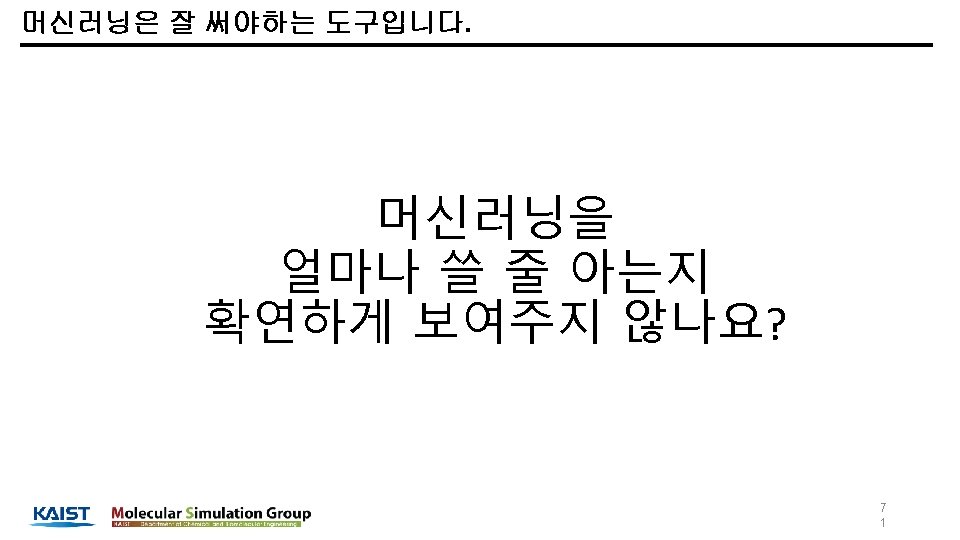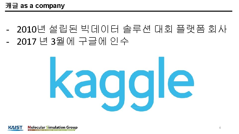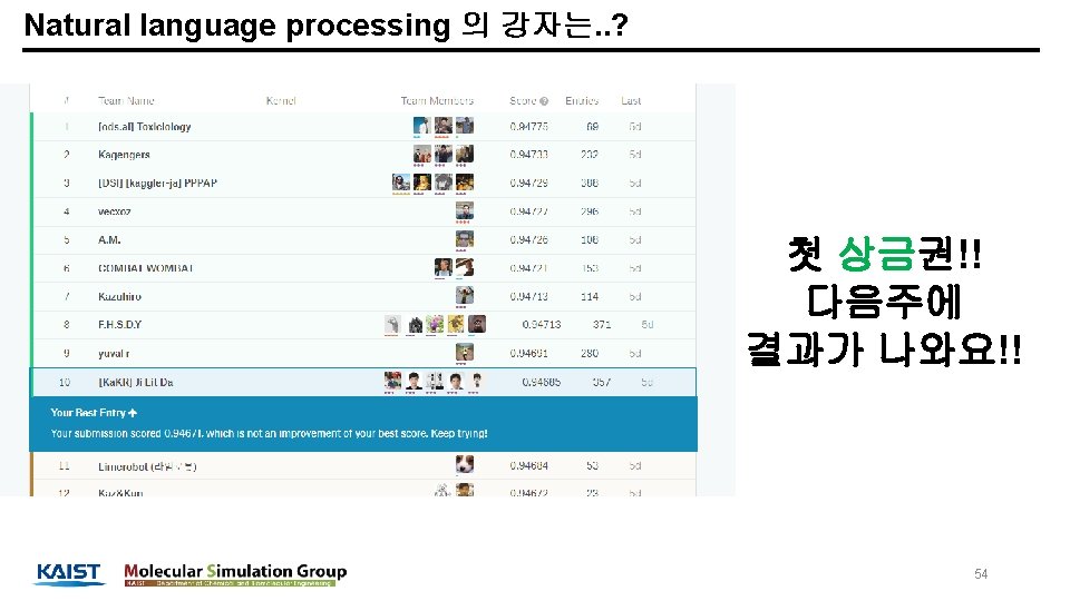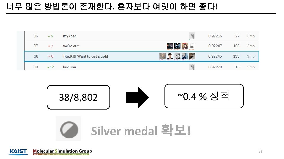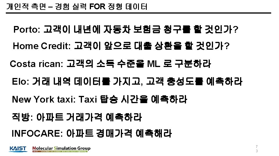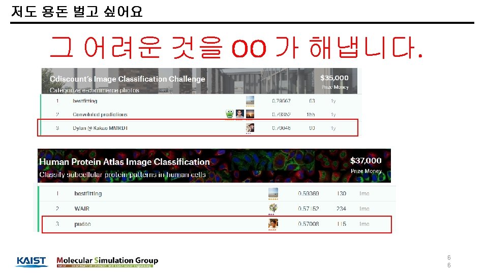 학력 학부 : 부산대학교 화공생명공학부 졸업 (2008. 03 ~ 2014. 02) 석사: KAIST 생명화학공학과 졸업 (2014. 03 ~ 2016. 02) 박사: KAIST 생명화학공학과 박사과정 재학중 (2016. 03 ~ 현재) 실험실: Molecular Simulation Laboratory (Prof. Jihan Kim) 세부 전공: Molecular simulation, computational chemistry, Machine learning, deep learning 활동 Kaggle. Korea 페이스북 온라인 그룹(현재 약 5, 600명) 운영자 캐글 상위 0. 5% 이유한 1