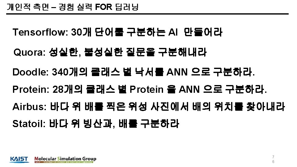 개인적 측면 – 경험 실력 FOR 정형 데이터 - Model evaluation Various metrics - Accuracy Precision Recall F 1 -score Etc. - Other technique Machine learning pipeline - - My pipeline code Feature management 정형 데이터 위해 학습한 모델만, , , 천단위 이상으로 만들어 봤을 겁니다. 7 5