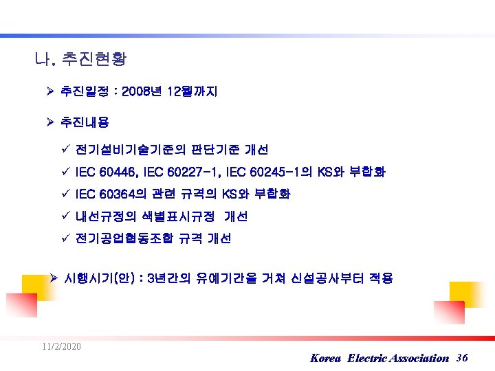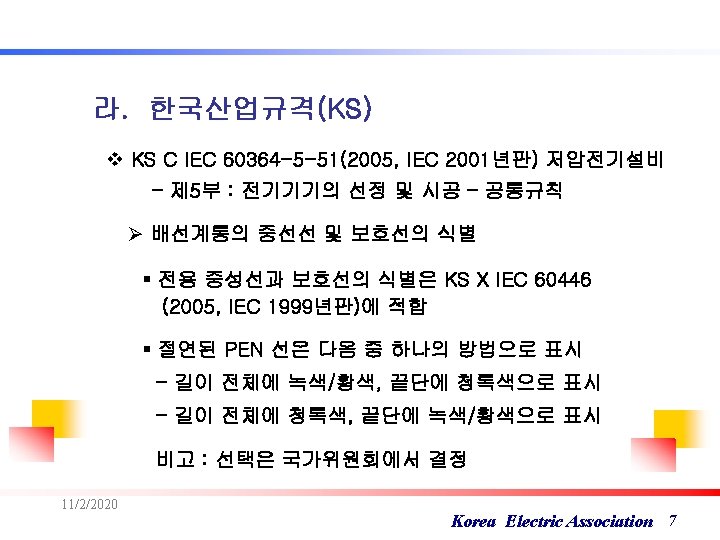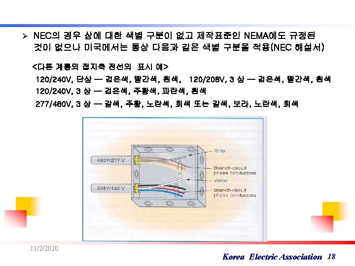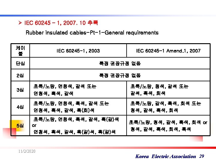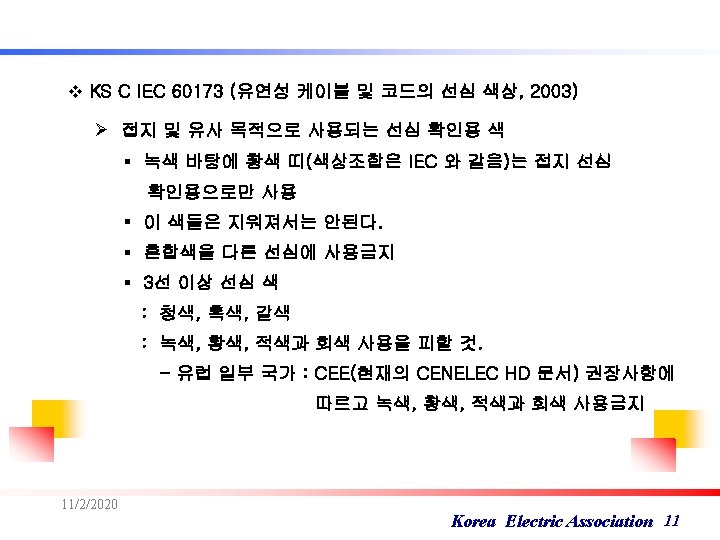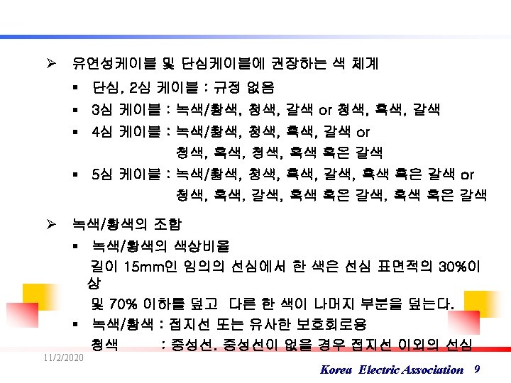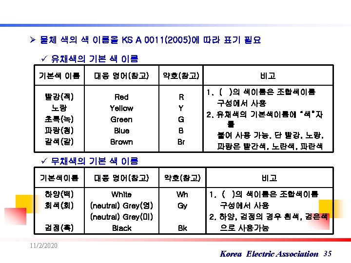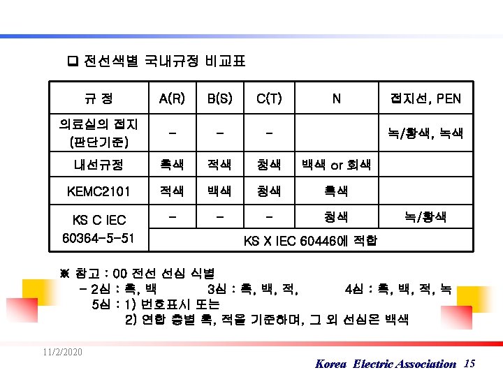 국내·외 전선색별표시 규정현황 및 개선추진현황 2008. 4. 11 대한전기협회 이주철팀장 ( Korea Electric Association ) 11/2/2020 Korea Electric Association 1