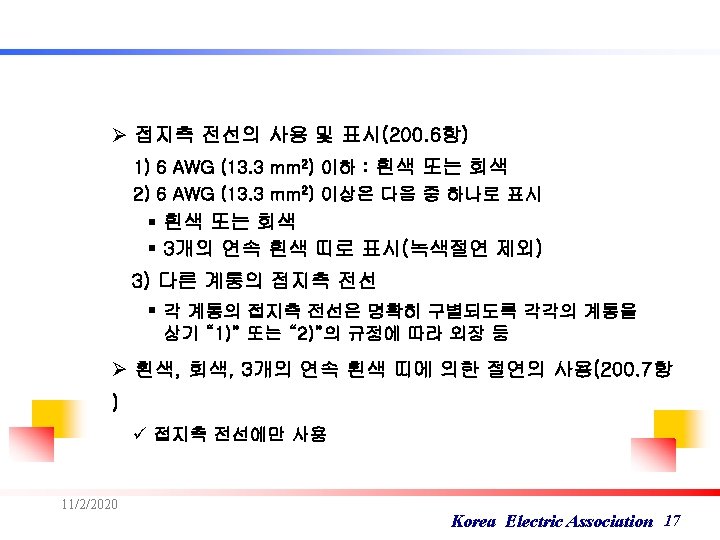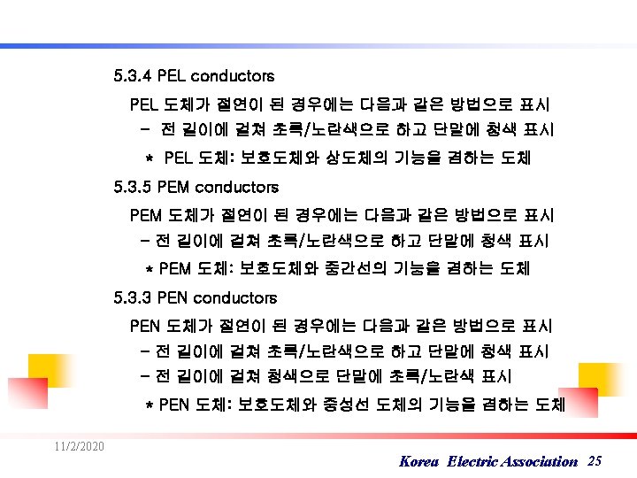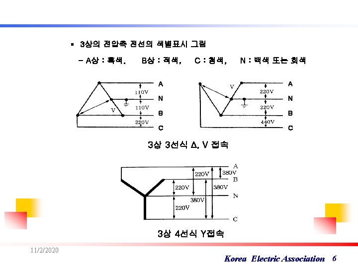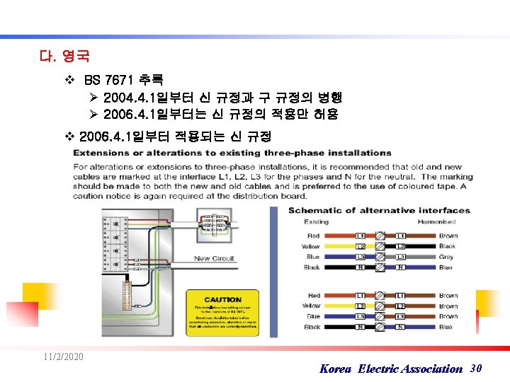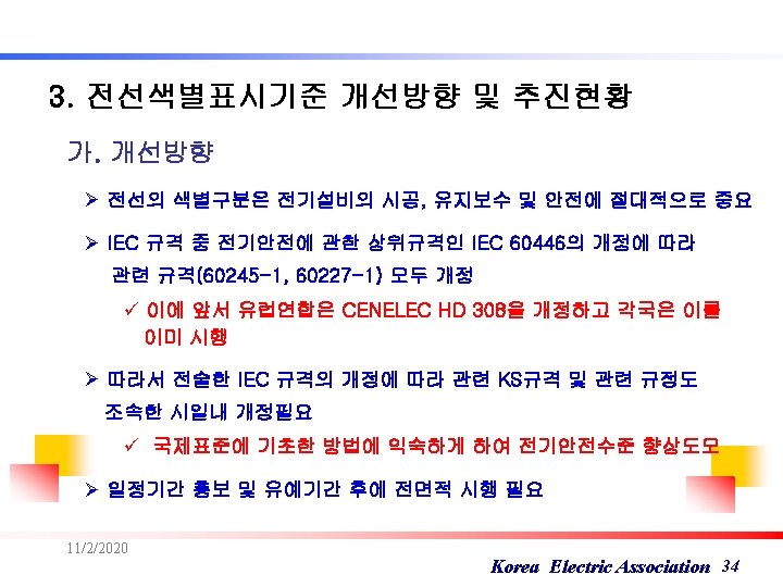 v 각국별 현재의 규정 구분 L 1 L 2 L 3 중성선 접지/보호도체 미국 (일반적 방법) Black Red Blue White or Gray 접지도체는 나선도 가능 미국 (대안으로 가능) Brown Orange Yellow Gray or White Green 캐나다 (강제규정) Red Black Blue White Green (or bare copper) 캐나다 (독립계통) Orange Brown Yellow White Green 인도 Red Yellow Blue Black Green 호주/뉴질랜드(AS/NZS 3000: 2000 Sec. 3. 8. 1) Red White (이전은 노랑) Blue Black Green/yellow striped (옛날은 초록) 유럽 구 규격(IEC 60446, 국가별 비강제) Brown or black Black or brown Blue Green/yellow striped 영국, 남아공, 말레지아 등 (2006. 4까지) Red Yellow Blue Black Green/yellow striped (1970 이전은 초록) Brown Black Grey Blue Green/yellow striped 영국 등 유럽 (HD 308, 2004/5), (IEC 60446, 2007) 11/2/2020 Korea Electric Association 33