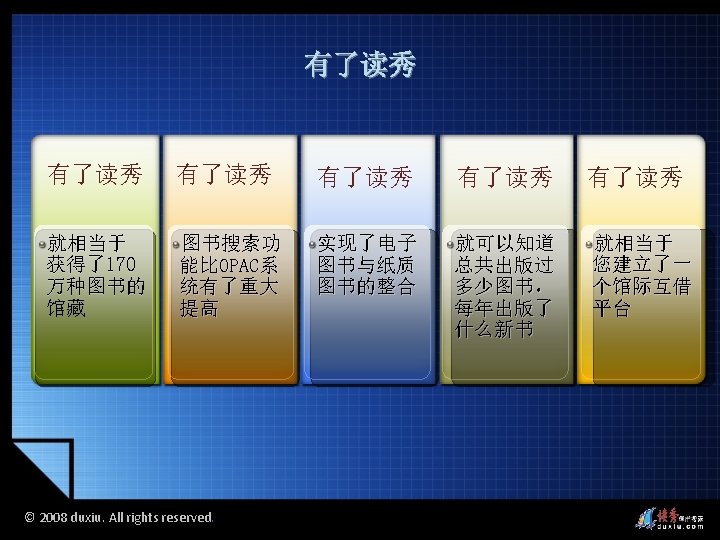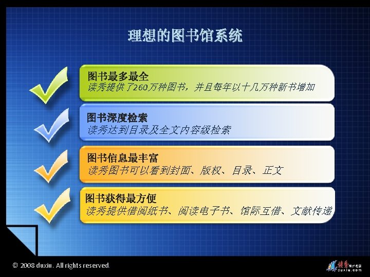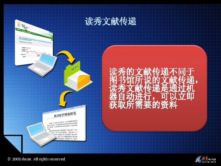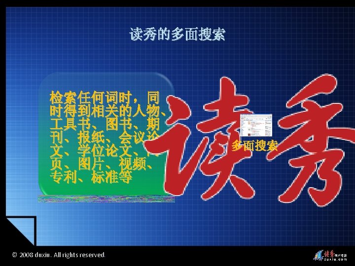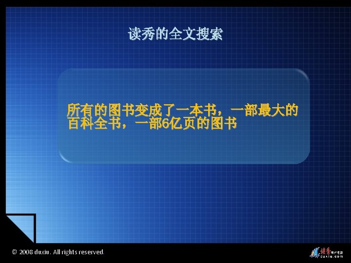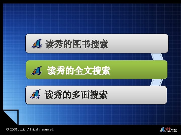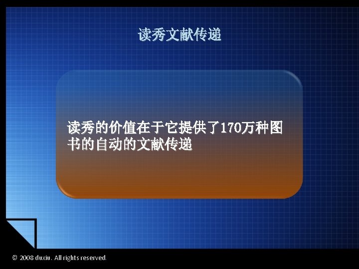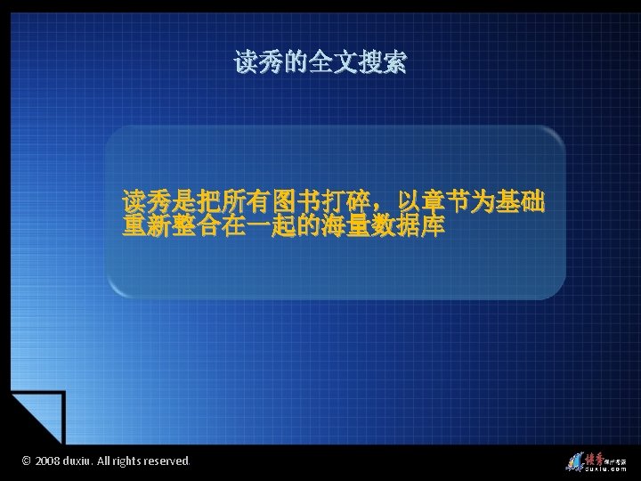 2008 duxiu All rights reserved 2008 duxiu All Slides: 45 Download presentation 读秀的图书搜索 读秀的多面搜索 © 2008 duxiu. All rights reserved. © 2008 duxiu. All rights reserved. 图书封面 图书信息 © 2008 duxiu. All rights reserved. 图书版权页 © 2008 duxiu. All rights reserved. 图书目录页 © 2008 duxiu. All rights reserved. 图书正文页 基于IE浏览 无需下载阅读器 © 2008 duxiu. All rights reserved. 借阅图书 © 2008 duxiu. All rights reserved. 浙江大学图书馆 馆藏信息 © 2008 duxiu. All rights reserved. 其它图书馆 馆藏信息 © 2008 duxiu. All rights reserved. 网上书店 购买信息 © 2008 duxiu. All rights reserved. 本馆电子全文 © 2008 duxiu. All rights reserved. © 2008 duxiu. All rights reserved. 演示文献传递 © 2008 duxiu. All rights reserved. 图书馆文献 传递中心 © 2008 duxiu. All rights reserved. 提交咨询传递 表单 © 2008 duxiu. All rights reserved. 咨询提交成功 © 2008 duxiu. All rights reserved. 登录邮箱 © 2008 duxiu. All rights reserved. 收到咨询传递 回复邮件 © 2008 duxiu. All rights reserved. 点击文献阅读 超链接 © 2008 duxiu. All rights reserved. 通过传递获得 的原文 © 2008 duxiu. All rights reserved. 全文检索 © 2008 duxiu. All rights reserved. 检索词在原文中 标亮显示 © 2008 duxiu. All rights reserved. © 2008 duxiu. All rights reserved. 本页来源 © 2008 duxiu. All rights reserved. © 2008 duxiu. All rights reserved. 摘录文字 © 2008 duxiu. All rights reserved. © 2008 duxiu. All rights reserved. © 2008 duxiu. All rights reserved. © 2008 duxiu. All rights reserved. 粘贴原文 到word中 © 2008 duxiu. All rights reserved. 读秀的全文搜索 读秀的多面搜索 © 2008 duxiu. All rights reserved. 相关词条 相关人物 相关期刊 © 2008 duxiu. All rights reserved.