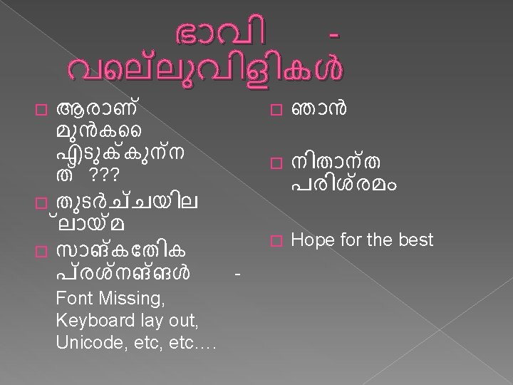History & Purpose The government of Kerala has launched a state wide campaign for Malayalam computing, which was inaugurated by chief minister V S Achuthanandan on 8 th June 2008. � The campaign aims at strengthening the local language, Malayalam, using the possibilities provided by Information and Communication Technologies (ICT) and will also address the linguistic barrier, which prevents the people of Kerala from taking advantage of new technologies. �