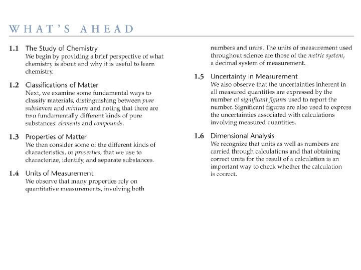 1. 1 THE STUDY OF CHEMISTRY UTHE ATOMIC AND MOLECULAR PERSPECTIVE OF CHEMISTRY § Chemistry is the study of the properties and behavior of matter. § Matter: the physical material of the universe; anything that has mass and occupies space § Property: any characteristic that allows us to recognize a particular type of matter and to distinguish it from other types § Elements: basic substances that comprise matters § Atoms: infinitesimally small building blocks of matter § Molecules: matters in which two or more atoms are joined together in specific shapes