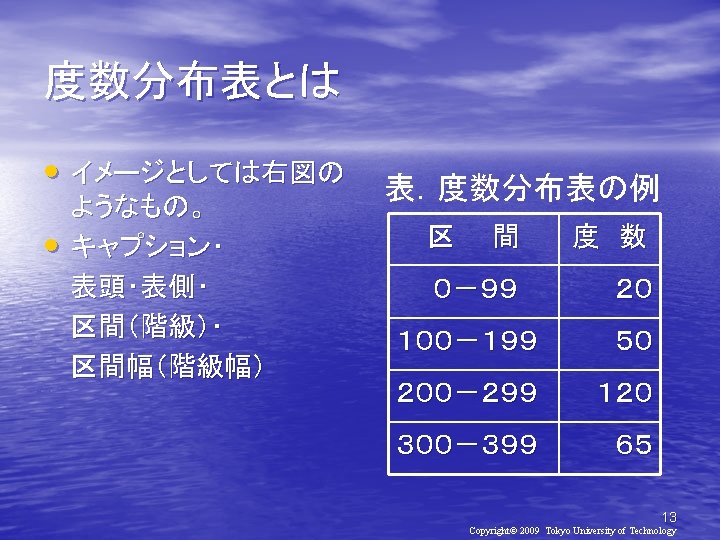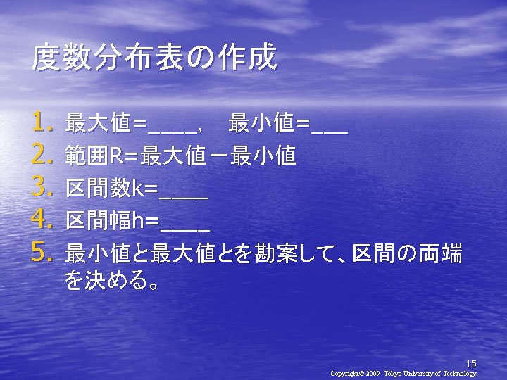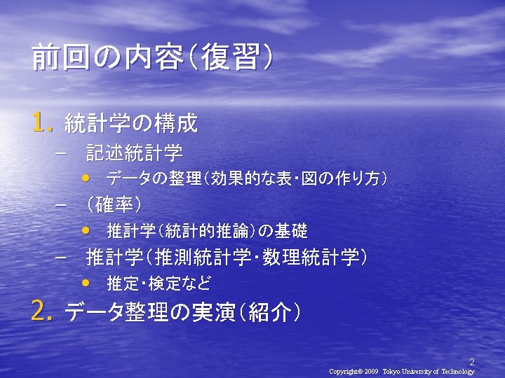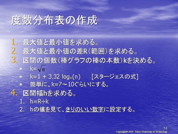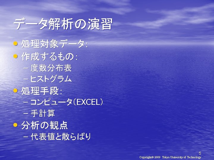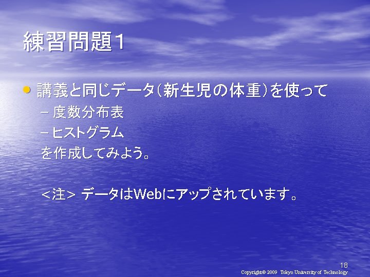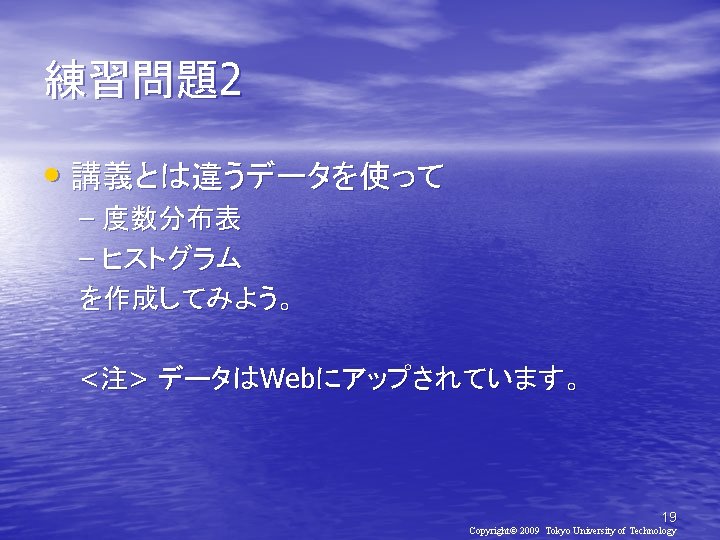 2010 2010 930 Copyright 2010 Tokyo University of Slides: 21 Download presentation 確率と統計2010(第2日目) メディア学部 2010年 9月30日(木) 担当教員:亀田弘之 Copyright© 2010 Tokyo University of Technology 処理対象データ • http: //kameken. clique. jp/Lectures/ Lectures 2010/Stat 2010/index. html 6 Copyright© 2009 Tokyo University of Technology 手順1: EXCELの起動 [スタート]-[すべてのプログラム][Microsoft Office]-[Microsoft Excel 2007] 手順2:データの入力 8 Copyright© 2009 Tokyo University of Technology 9 Copyright© 2009 Tokyo University of Technology 手順1: EXCELの起動 [スタート]-[すべてのプログラム][Microsoft Office]-[Microsoft Excel] 手順2: データの入力 手順3: 度数分布表の作成 10 Copyright© 2009 Tokyo University of Technology 度数分布表の作成 11 Copyright© 2009 Tokyo University of Technology 新生児の体重(1998年) 体重(g) 人数 ~ 2000 0 2000~ 2400 3 2400~ 2800 14 2800~ 3200 16 3200~ 3600 14 3600~ 4000 7 4000~ 4400 4 4400~ 4800 2 16 Copyright© 2009 Tokyo University of Technology 17 Copyright© 2009 Tokyo University of Technology おわり 21 Copyright© 2009 Tokyo University of Technology