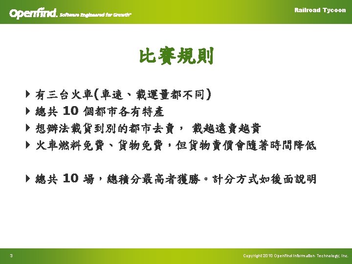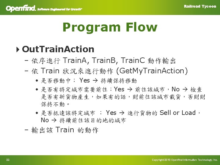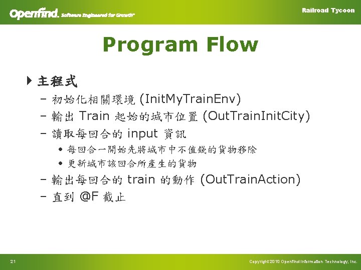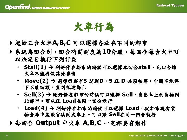 Railroad Tycoon Common Function 4 Init. Train. Status – int train. No, int city. No – 初始化 Train 的位置及狀態 4 Move. Train – int train. No, int source, int dest – 移動列車 4 Income – const char* sell. Time, int sell. City. No, int sell. Cargo. Id – 售販該貨物所獲得的錢 23 Copyright 2010 Openfind Information Technology, Inc.