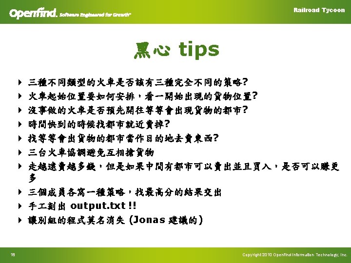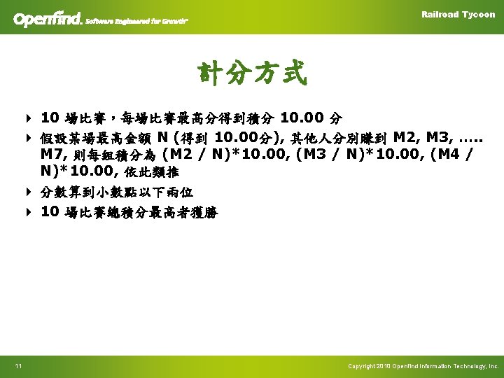 Railroad Tycoon I/O 以及 錯誤處罰 4 總共有 Input 01. txt. . Input 10. txt 4 程式讀入 Input 01. txt,產生 Output 01. txt,依此類推 4 Checker程式讀入 (Input 01. txt, Output 01. txt),產生本場比賽 分數(賺多少錢,算到小數點以下兩位),依此類推 4 發生任何系統錯誤,該場比賽 0 分 4 Checker debug log 放在 debug. txt 12 Copyright 2010 Openfind Information Technology, Inc.