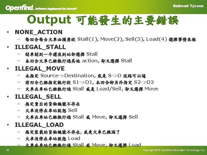 Railroad Tycoon Output file format 15 @I: T 1, T 2, T 3 起始A, B, C三台火車各放在T 1, T 2, T 3 @T: DDD: HH: MM 每回合第一行,代表時間 @[A-C]: [1 -4], p 1, p 2, p 3… [A-C]為火車代號,[1 -4]為action @A: 1 (代表火車A此回合 Stall) @B: 2, 2, 3 (代表火車B此回合從 London(2) Move to Paris(3)) @C: 3, 1, 1, 4 (代表火車C此回合賣出 三車貨物, 貨物ID各為 1, 1, 4) @C: 4, 6, 6 (代表火車C此回合裝載兩 車貨物, 貨物ID各為 6, 6) @E 每回合的最後一行,代表回合結束 Sample @I: 4, 9, 1 @T: 001: 00: 10 @A: 4, 1, 1 @B: 2, 9, 8 @C: 1 @E @T: 001: 00: 20 @A: 2, 4, 2 @B: 2, 9, 8 @C: 1 @E Copyright 2010 Openfind Information Technology, Inc.