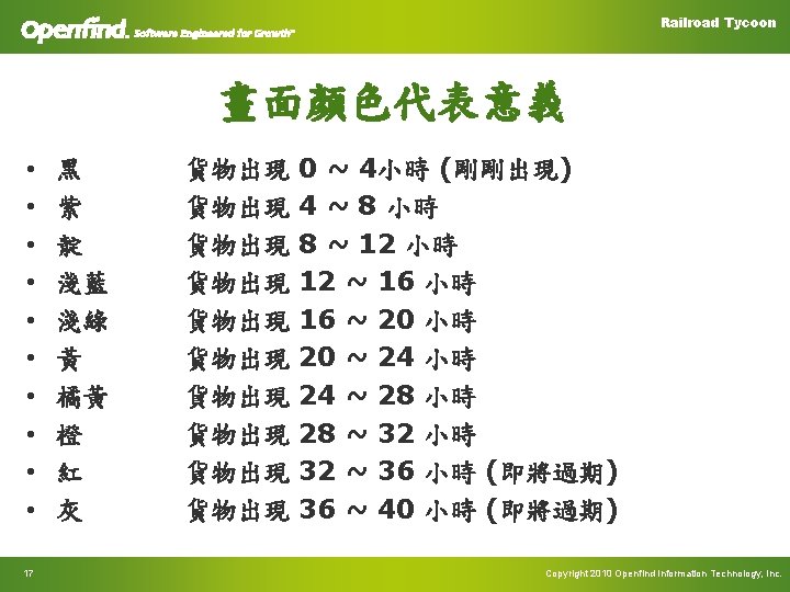 Railroad Tycoon 火車 C -- Class E 111 4 速度 120 KM / Hour 4 10 節車廂 6 Copyright 2010 Openfind Information Technology, Inc.