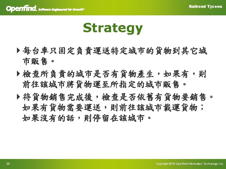 Railroad Tycoon Common Function 4 Sell. Train. Carriage – int train. No, int train. Carriage. Index – 銷售列車上的貨物 4 Get. City. Cargo – int city. No – 取得城市中的貨物 4 Load. Train. Carriage – int train. No, int cargo. Id, int carriage. Index – 將貨物載入到列車中 24 Copyright 2010 Openfind Information Technology, Inc.