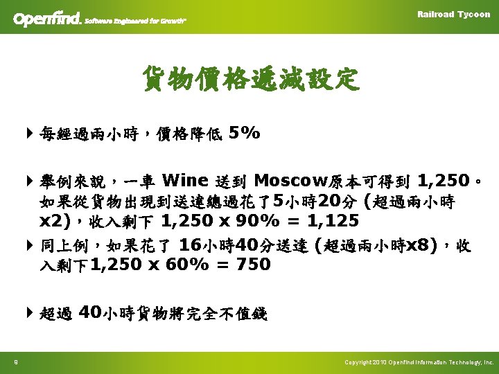 Railroad Tycoon 貨物運送價目表 (不可賣給產地) 收購價格/車 Coal(煤) Birmingham London 伯明罕(0) 倫敦(1) Amsterdam 阿姆斯特丹 (3) Paris 巴黎(2) Frankfurt Berlin 法蘭克福(4) 柏林(5) Munich Vienna Warsaw 慕尼黑(6) 維也納(7) 華沙(8) Moscow 莫斯科(9) 0 75 250 522 577 840 810 1020 1235 2030 60 0 140 350 395 570 530 744 875 1485 Wine(葡萄酒) 200 140 0 180 220 395 375 530 670 1250 Tulip(鬱金香) 375 310 160 0 335 180 455 435 395 935 Computer(電腦) 464 396 220 374 0 140 120 262 374 960 Steel(鋼鐵) 672 575 396 200 140 0 262 241 200 720 Beer(啤酒) 560 480 335 457 108 235 0 126 283 785 Wood(木材) 740 670 477 436 218 126 0 144 603 Amber(琥珀) 980 805 660 440 370 200 315 160 0 440 2430 2230 1830 1456 1335 1008 1225 925 615 0 Mail(郵件) Oil(石油) 7 Copyright 2010 Openfind Information Technology, Inc.
