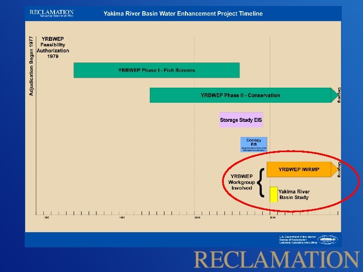 YRBWEP Phases 1 and 2 Implemented • Phase 1 authorized in 1984 • Rebuilding fish ladders • Constructing fish screens on river diversions • Work proceeded through the 1990 s • Phase 2 authorized in 1994 • Water conservation and acquisition (cost shared) • Conduct water needs studies for fish & current irrigators • Make improvements to the Wapato Irrigation Project (WIP) • Develop interim plan for managing basin water supplies