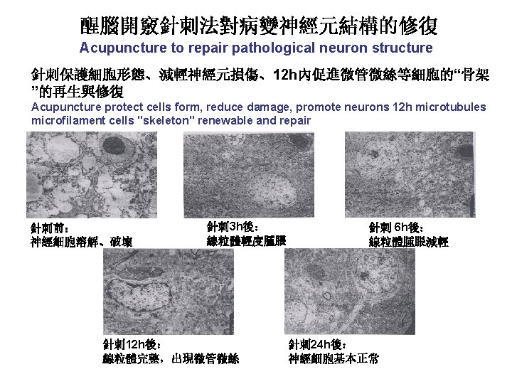 針刺治療缺血性中風病的機理研究 The mechanism research of Acupuncture treatment ischemic stroke 機理研究緊扣中風病的治療難點及突破點,聚焦在神經與血 管的再生。研究針刺手段促進損傷後腦迴圈重建及神經細胞再生 的作用,從形態學、生物化學、中樞神經機制、分子生物學等方 面開展了二十餘項基礎實驗。 Defines the mechanism research and treatment of apoplexy, focusing on nerve and breakthrough of blood vessels. Research methods to promote the head injury acupuncture and nerve cells regeneration cycle, from the morphology, biochemistry, molecular biology, central nervous mechanism for more than twenty experiments.