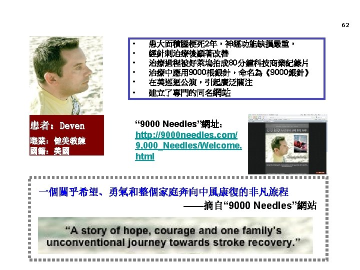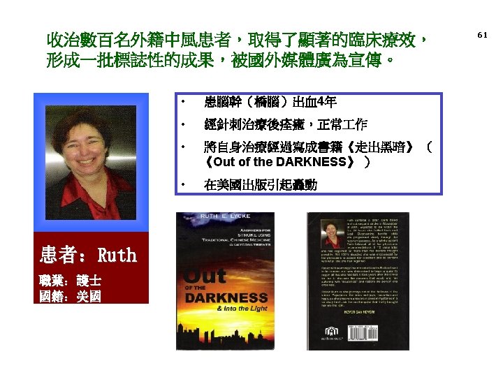 以“醒腦開竅”針法、丹芪偏癱膠囊為組合的針藥結合治療缺血性中風 病取得了巨大的成果 60 “XNKQ” acupuncture therapy and Danqi hemiplegia capsule, treatment of ischemic apoplexy made great achievements • 國家科技部、中醫藥管理局科技成果推廣專案 National science and technology department, administration of traditional Chinese medicine science promotion project • 已推廣到全國和世界60多個國家和地區,形成了輻射全球的技術平台 Has extended to the world in more than 60 countries and regions of the world, formed the radiation technology platform