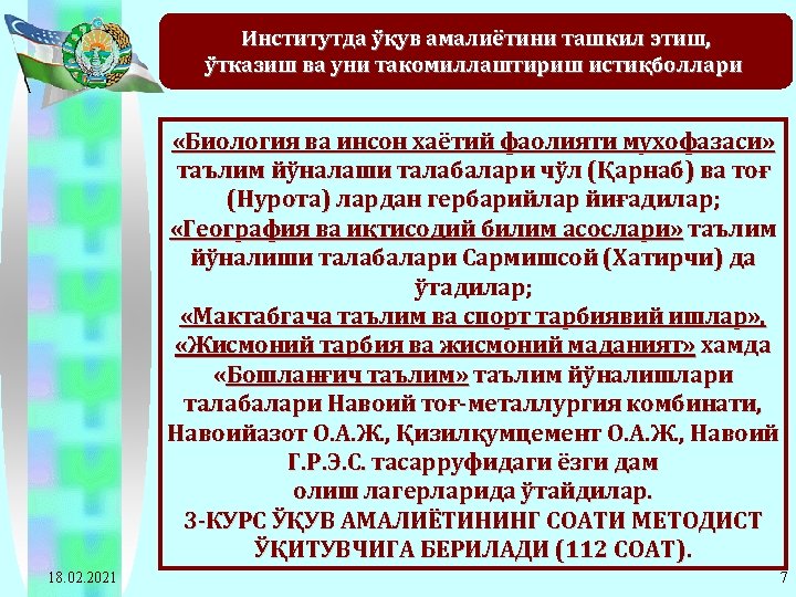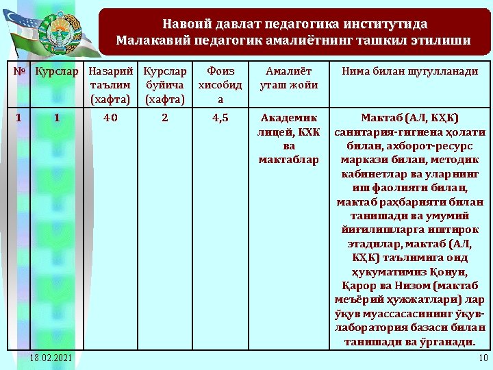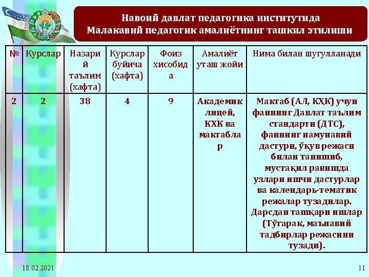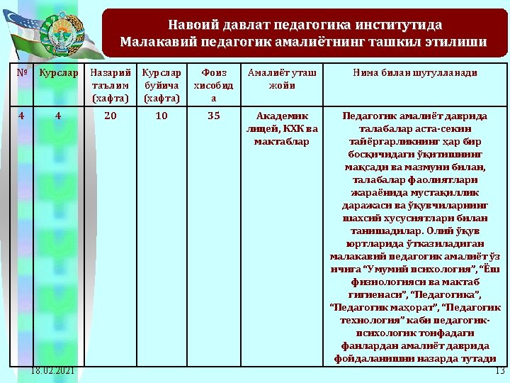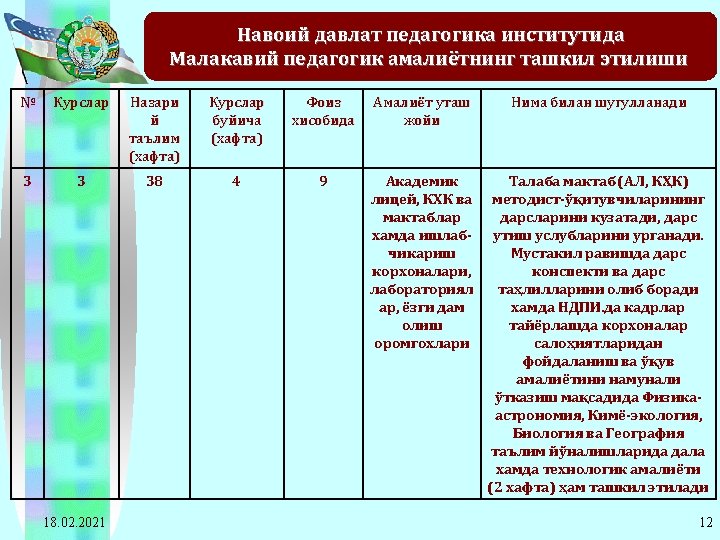 2011 -2012 o’quv yilida Navoiy davlat pedagogika instituti bitiruvchi 4 -kurs talabalarining ta’lim yo’nalishlari kesimida pedagogik amaliyotiga rahbarlik qiladigan ta’lim muassasalariga ajratilgan soatlarning taqsimot jadvali 10 Matematikainformatika 133 133*12= 1596 133*2= 266 2128 11 Fizikaastronomiya 58 58*12= 696 58*2=116 928 12 O’zbek tili 145 145*12= 1740 145*2= 290 2320 13 Tarix 62 62*12= 744 62*2=124 992 14 Milliy istiqlol g’oyasi 82 82*12= 984 82*2=164 1312 15 Jismoniy tarbiya va jismoniy madaniyat 124 124*12= 1488 124*2= 248 1984 16 Qozoq tili va adabiyoti 21 21*12= 252 21*2=42 336 17 Rus tili va adabiyoti 51 51*12= 612 51*2=102 816 18 Ingliz tili va adabiyoti 119 119*12= 1428 119*2= 238 1904 Jami: 18. 02. 2021 20672