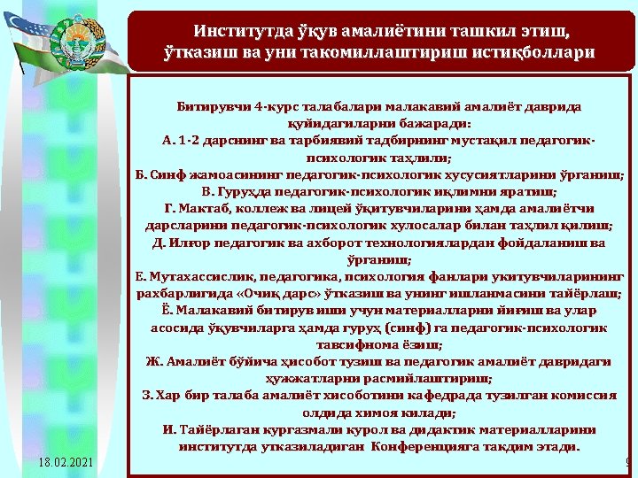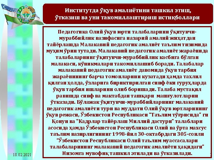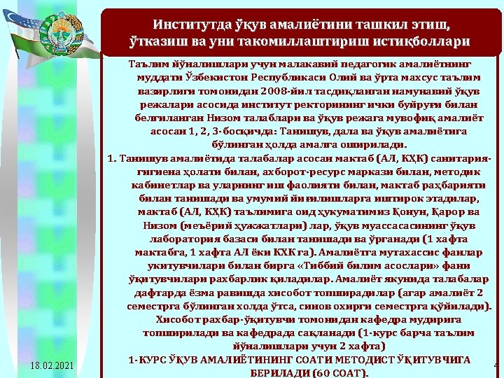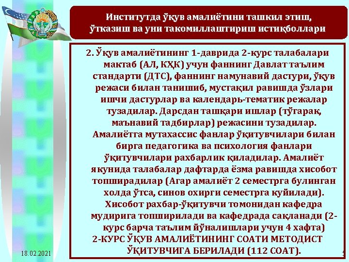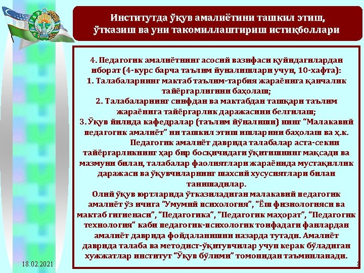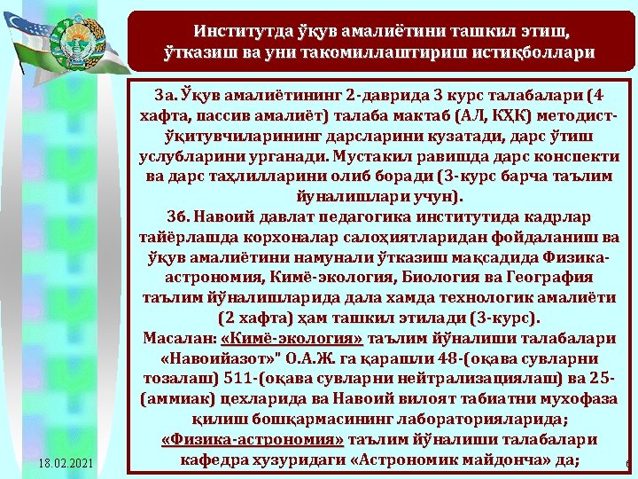 2011 -2012 o’quv yilida Navoiy davlat pedagogika instituti bitiruvchi 4 -kurs talabalari pedagogik amaliyotiga rahbarlik qiladigan ta’lim muassasalariga ajratilgan soatlarning taqsimot jadvali T/r Oliy ta’lim muassasasi nomi Umumiy talabalar soni Ta’lim muassasasi rahbariga ajratilgan soat Ta’lim muassasasi rahbari muoviniga ajratilgan soat 1 Navoiy davlat pedagogika instituti 1292*1=1292 18. 02. 2021 Metodist. Guruh Umumiy rahbarga murabbiy- ajratilgan ligi ishi gan soat rahbariga ajratilgan soat 1292*12= 15504 1292*2= 2584 20672