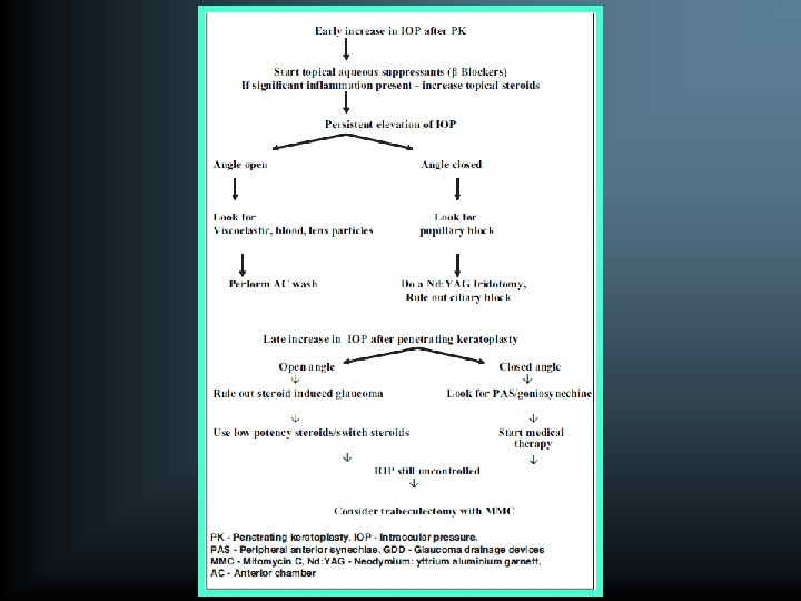 Laser trabeculoplasty • open angles, clear grafts, and moderately elevated IOP (20 -25 mm. Hg) on glaucoma medications. • post-operative IOP spikes and uveitis, which can trigger graft rejection Laser iridotomy • Pupillary block is suspected • Gonioplasty can be done for PAS, which has been present for less than one year