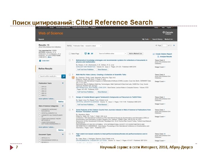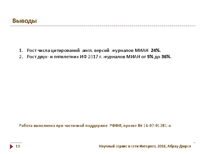 Влияние на пятилетние импакт-факторы журналов 2017 г. Журнал Найдено потерянных цитирований из публикаций 2017 г. к статьям журнала 2012 -2016 гг. 35 Pасчет пятилетнего импакт-фактора 2017 г. Рост пятилетнего импакт-фактора 2017 г. 0. 781=200/256 21% Mathematical Notes 60 0. 428=445/1040 16% Sbornik: Mathematics 64 0. 666=251/377 34% Theoretical and Mathematical Physics Theory of Probability and its Applications Proceedings of the Steklov Institute of Mathematics Russian Mathematical Surveys 24 0. 798=516/647 5% 10 0. 435=104/239 11% 30 0. 491=338/688 10% 37 1. 391=249/179 17% Functional Analysis and Its Applications 14 0. 587=115/196 14% Izvestiya: Mathematics 10 Научный сервис в сети Интернет, 2018, Абрау-Дюрсо