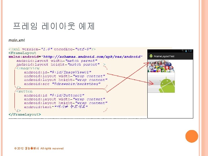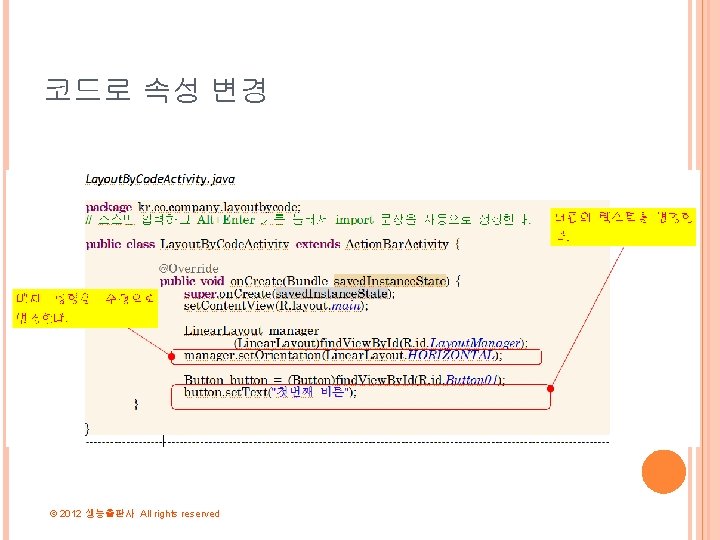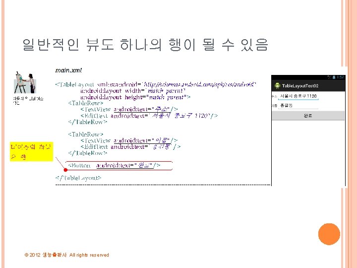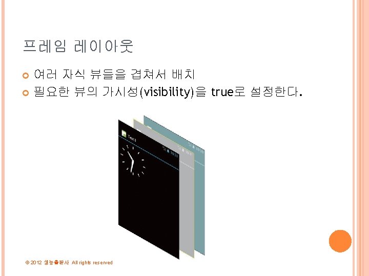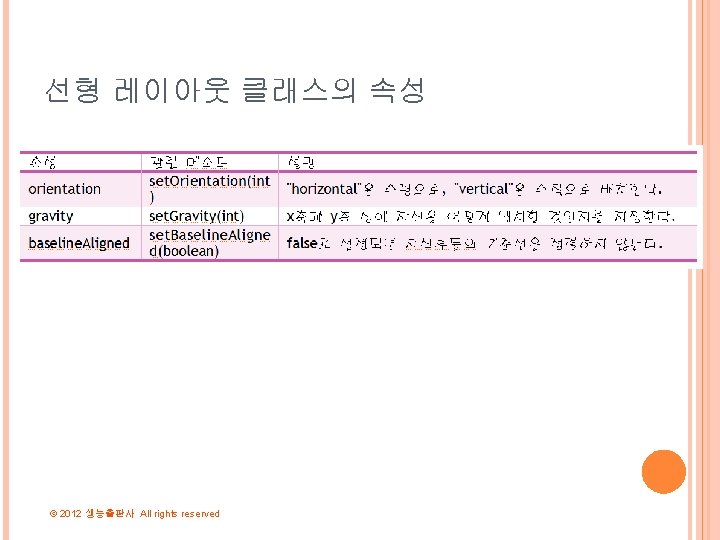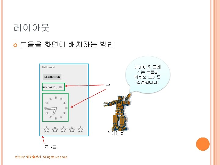 2012 All rights reserved 2012 All rights reserved Slides: 24 Download presentation 레이아웃의 종류 © 2012 생능출판사 All rights reserved 선형 레이아웃 © 2012 생능출판사 All rights reserved 선형 레이아웃 © 2012 생능출판사 All rights reserved GRAVITY 속성 값 © 2012 생능출판사 All rights reserved GRAVITY 속성 © 2012 생능출판사 All rights reserved 자식 뷰들의 베이스 라인 정렬 <Linear. Layout xmlns: android="http: //schemas. android. com/apk/res/android" android: orientation="horizontal“ android: layout_width="fill_parent" android: layout_height="fill_parent" android: baseline. Aligned="true" > <Linear. Layout … … android: baseline. Aligned="false" > © 2012 생능출판사 All rights reserved © 2012 생능출판사 All rights reserved 테이블 레이아웃 © 2012 생능출판사 All rights reserved 상대적 레이아웃 © 2012 생능출판사 All rights reserved 상대적 레이아웃 © 2012 생능출판사 All rights reserved 절대적 레이아웃 © 2012 생능출판사 All rights reserved LAB: 계산기 앱 작성 © 2012 생능출판사 All rights reserved