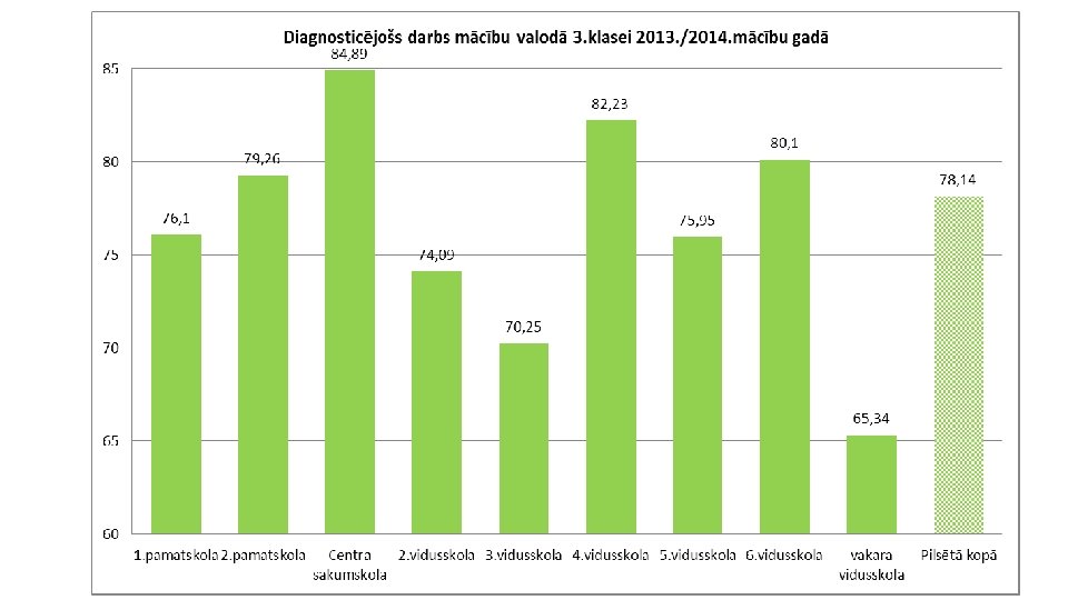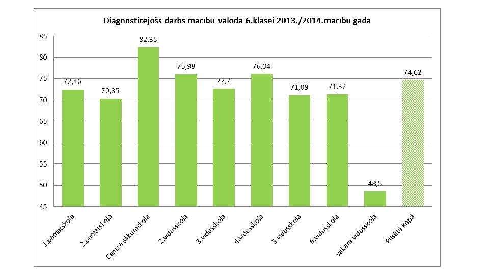 Valsts pārbaudes darbu mācību valodā rezultātu salīdzinājums šī gada 6. klasei ar viņu iegūtajiem rezultātiem 3. klases pārbaudes darbā 10 9, 5 9 8, 5 8 7, 5 2010. /2011. 7 6, 5 2013. /2014. 8, 3 8 7, 7 6 5, 5 5 6. a 6. b