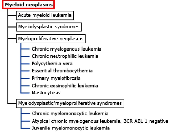 Myeloid neoplasms • Acute myeloid leukemia (AML) and related precursor neoplasms • Myelodysplastic syndrome • Myeloproliferative neoplasms • Myelodysplastic/myeloproliferative neoplasms