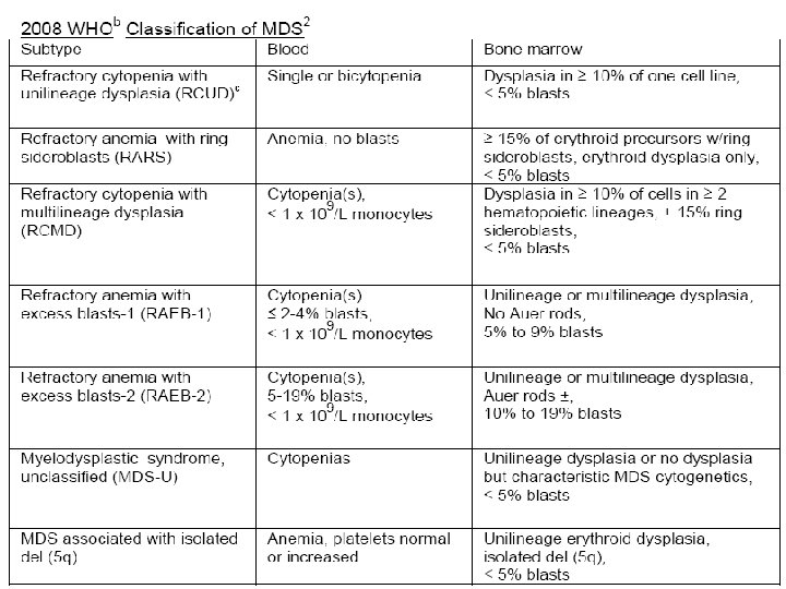 Classification of MDS • FAB § WHO § Refractory cytopenia with – Refractory anemia (RA) unilineage dysplasia (RCUD) – RA with ringed § RC with multilineage dysplasia sideroblasts (RARS) (RCMD) – RA with excess blasts § RA with ringed sideroblasts (RARS) (RAEB) § RA with excess blasts-1 – RAEB in (RAEB-I) transformation § RAEB-II (RAEB-t) § MDS, unclassified (MDS-U) – Chronic § MDS associated with myelomonocytic isolated del(5 q) leukemia (CMML)