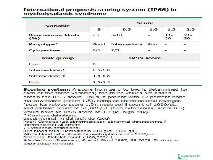 Response criteria for hematologic improvement: • Erythroid response — – Pretreatment Hb <11 g/d. L : increas by ≥ 1. 5 g/d. L for at least 8 weeks – A reduction in the units of red cell transfusions by an absolute number of at least 4 red cell transfusions per 8 weeks compared with the pretreatment transfusion number in the previous 8 weeks. (only red cell transfusions given for a Hb ≤ 9 g/d. L ) • Platelet response — – Pretreatment platelet count <100 x 109/L : • For patients starting with >20 x 109/L : increase of ≥ 30 x 109/L. • For those with from 10 x 109/L to < 20 x 109/L : an increase of at least 100 %. • Neutrophil response — – pretreatment neutrophil count <1 x 109/L : at least 100 percent increase and an absolute >0. 5 x 109/L. increase