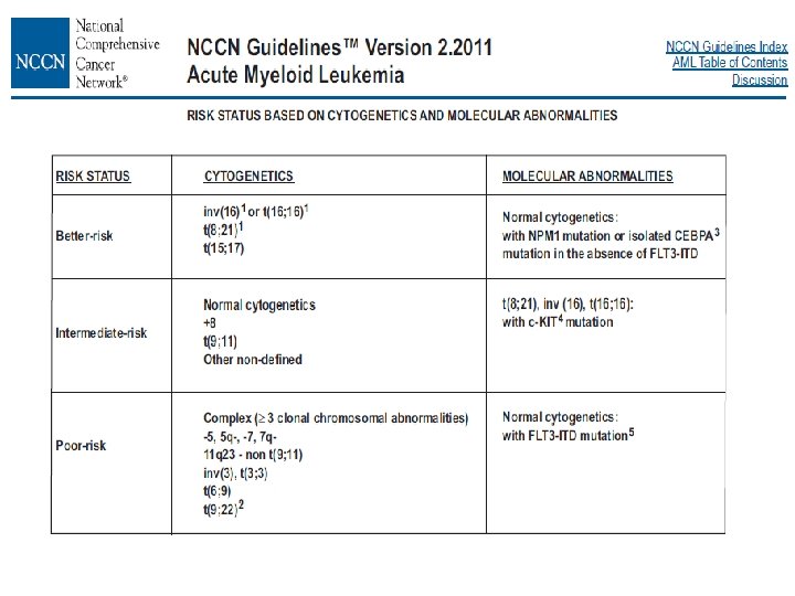 AML with recurrent genetic abnormalities • • • AML with t(8; 21)(q 22; q 22); RUNX 1 -RUNX 1 T 1 AML with inv(16)(p 13. 1 q 22) or t(16; 16)(p 13. 1; q 22); CBFB-MYH 11 Acute promyelocytic leukemia with t(15; 17)(q 22; q 12); PML-RARA AML with t(9; 11)(q 22; q 23); MLLT 3 -MLL AML with t(6; 9)(p 23; q 34); DEK-NUP 214 AML with inv(3)(q 21 q 26. 2) or t(3; 3)(q 21; q 26. 2); RPN 1 -EVI 1 AML (megakaryoblastic) with t(1; 22)(p 13; q 13); RBM 15 -MKL 1 AML with mutated NPM 1 AML with mutated CEBPA
