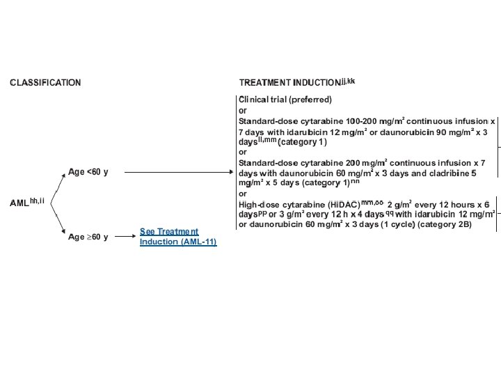 Treatment (AML) • Induction : anthracyclin (daunorubicin, idarubicin), cytarabine, cladribine • Consolidation : same as induction, or high dose cytarabine • Others : etoposide, mitoxantrone, fludarabine, clofarabine • Hypomethylating agents : 5 -azacytidine, decitabine