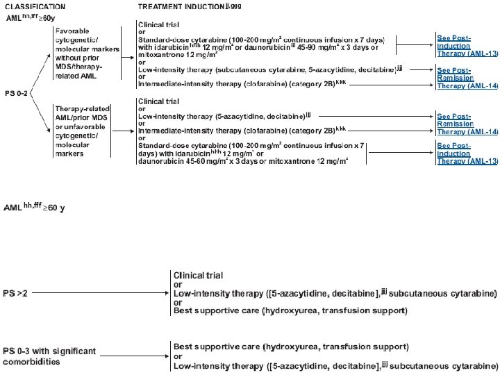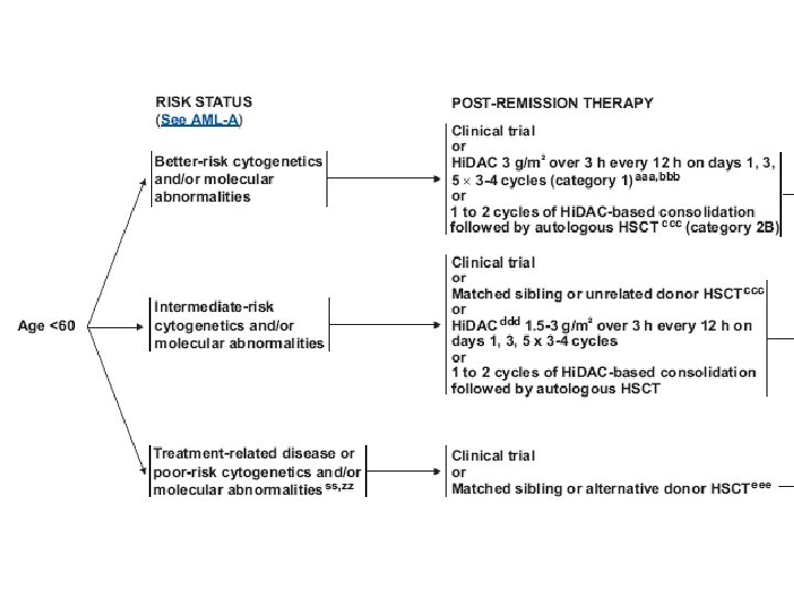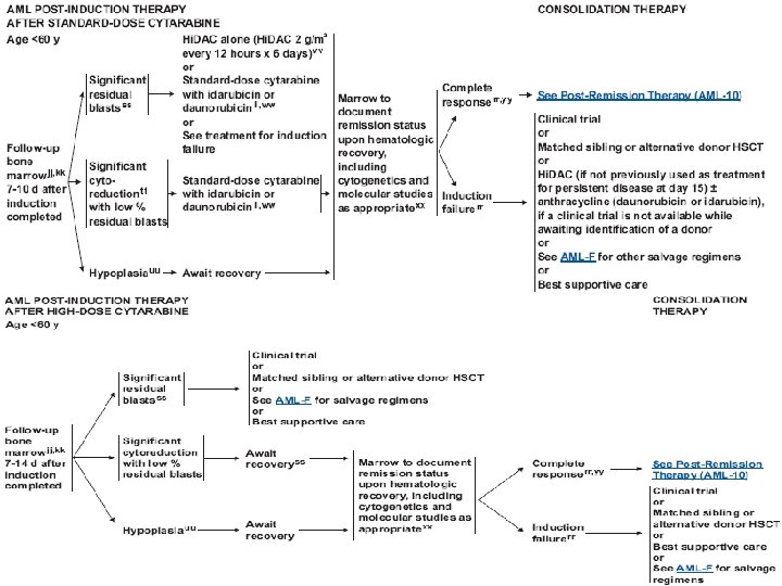Treatment (AML) • Induction chemotherapy • Postremission therapy – Consolidation – Hematopoietic cell transplantation • Supportive care – Blood transfusion – Infection control – Hematopoietic growth factors