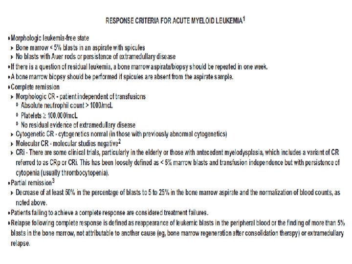 Bone marrow response (must persist for a minimum duration of four weeks) • Complete remission (CR) : – ≤ 5 % myeloblasts with normal maturation of all cell lines. – Dysplastic changes may be seen, but within the normal range of dysplastic changes. – Hemoglobin ≥ 11 g/d. L, platelets ≥ 100 x 109/L, neutrophils ≥ 1 x 109/L, and no circulating blasts. • Partial remission (PR) : – • Criteria for CR except BM blasts decreased by ≥ 50 %, but are still >5 % Marrow complete remission : – Marrow complete remission was developed to describe patients who have achieved a complete remission in the bone marrow, but have not recovered peripheral blood counts. • Stable disease : – Failure to achieve at least PR, but no evidence of progression for at least 8 weeks • Disease progression : – Defined by the percent blasts: those with <5 % blasts have a ≥ 50 % increase in blasts to >5 % blasts; those with 5 to 10 % blasts have a ≥ 50 % increase in blasts to >10 %; those with 10 to 20 % blasts have a ≥ 50 % increase to >20 % – Disease progression : an at least 50 % decrement from maximum remission/response in granulocytes or platelets, reduction in Hb by ≥ 2 g/d. L, or transfusion dependence.