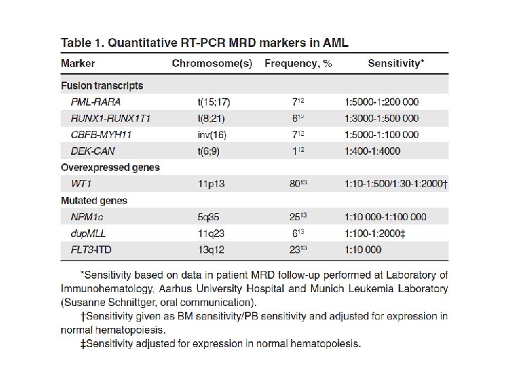 MRD (minimal residual disease) • No detectable disease was present by standard diagnostic tests, but who did nonetheless experience a recurrence of the leukemic clone • • Cytochemistry-assisted light microscopy Fluorescence in situ hybridization Real-time, fluorescence-based quantitative RT-PCR Multicolor flow cytometry : lack of specificity and of constancy over time of the aberrant antigen expression delineated at diagnosis